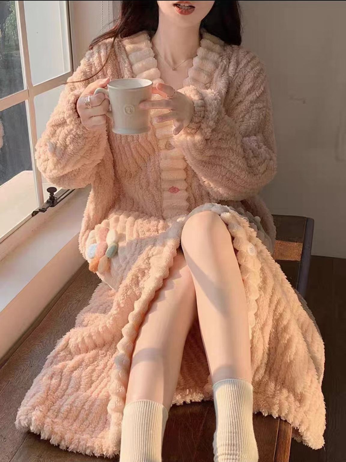 산호 양털 파자마 여성의 겨울 두꺼운 외부 착용 귀여운 플란넬 홈 옷 유행 느슨한 긴 카디건 세트스토어 가기