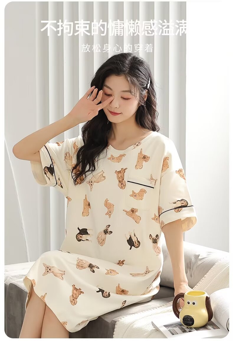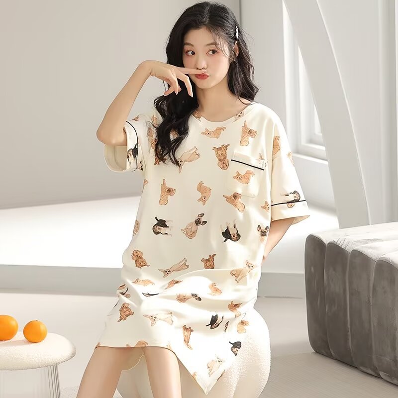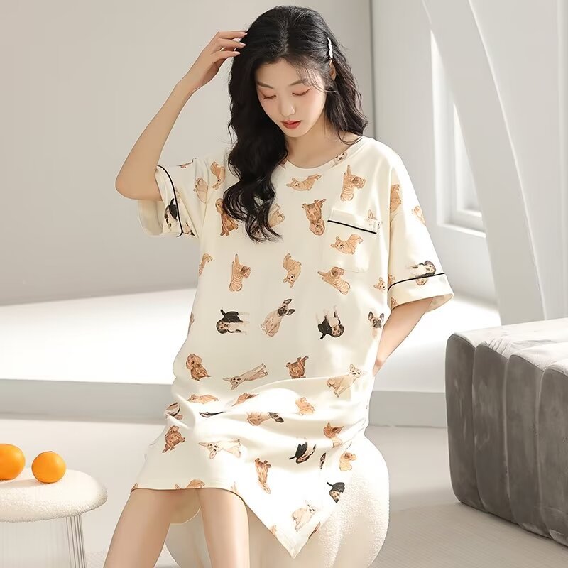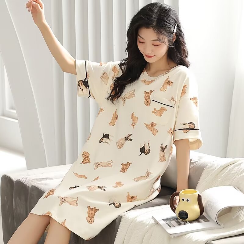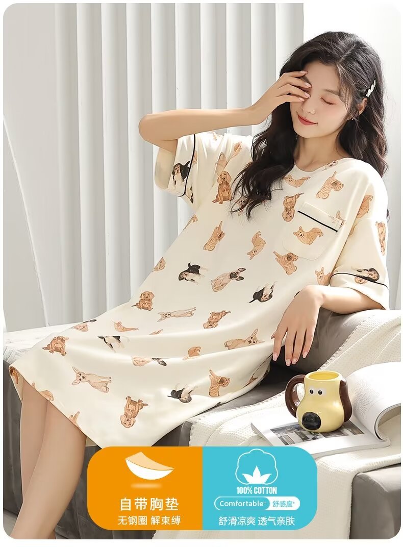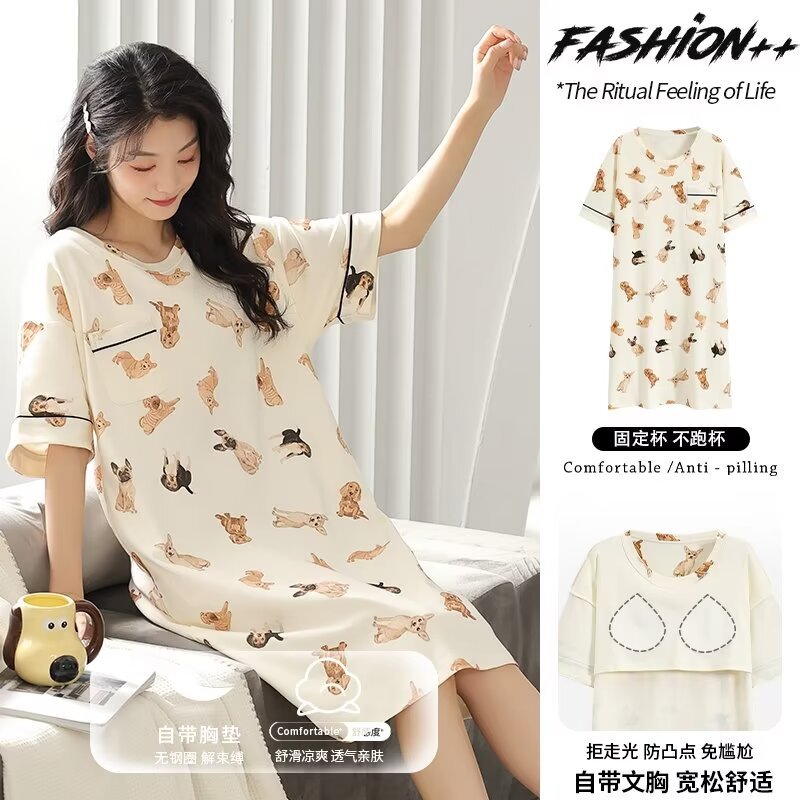 퓨어 코튼 여름 나이트 드레스 요정 스타일 중간 길이 간단한 얇은 브래지어 분리 가능한 만화 반팔 원피스 홈 의류스토어 가기