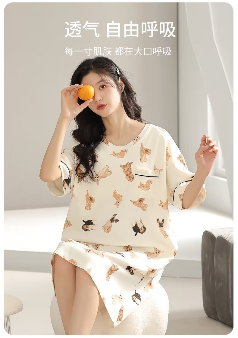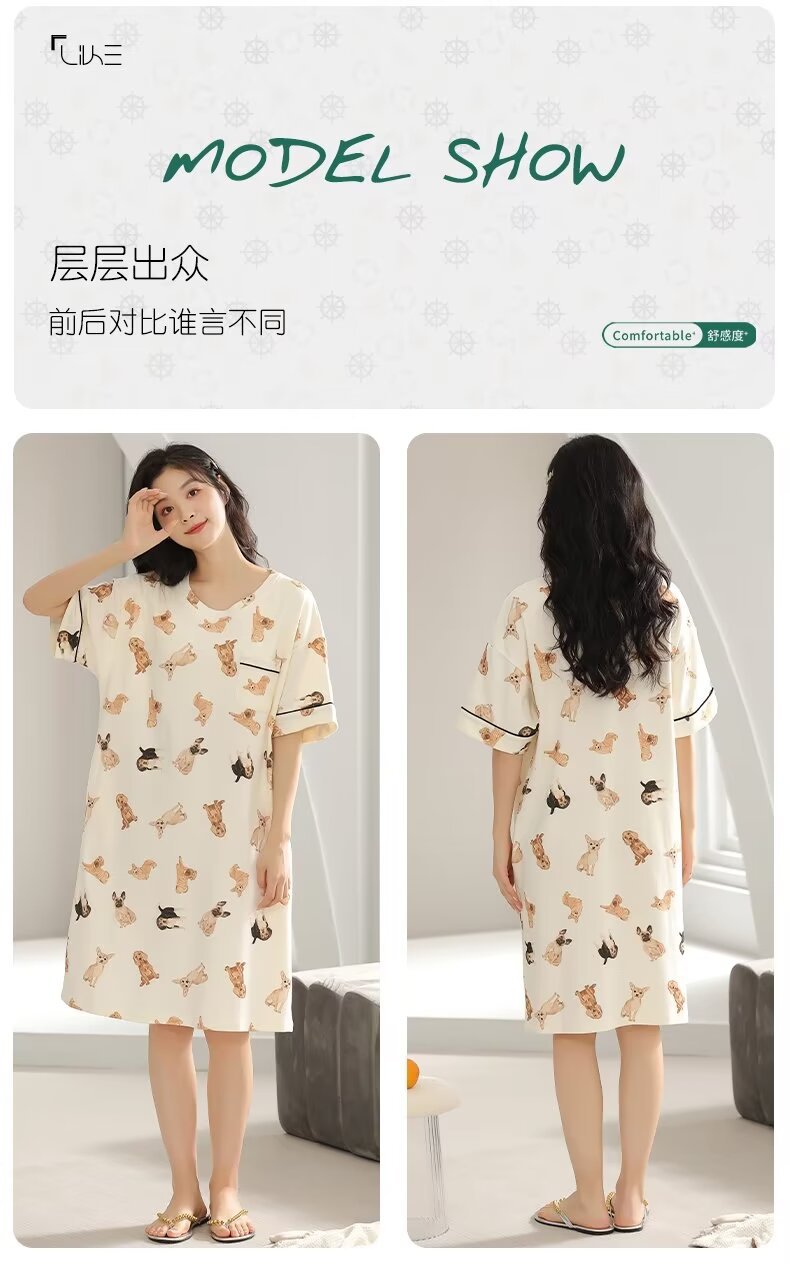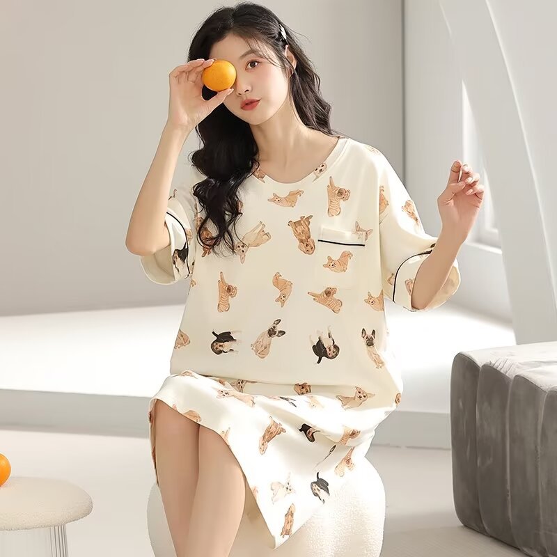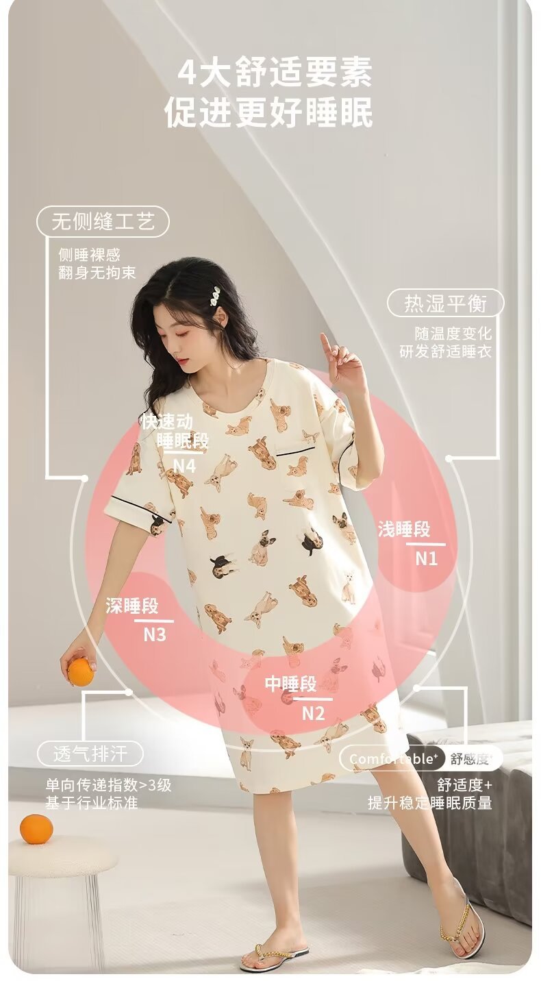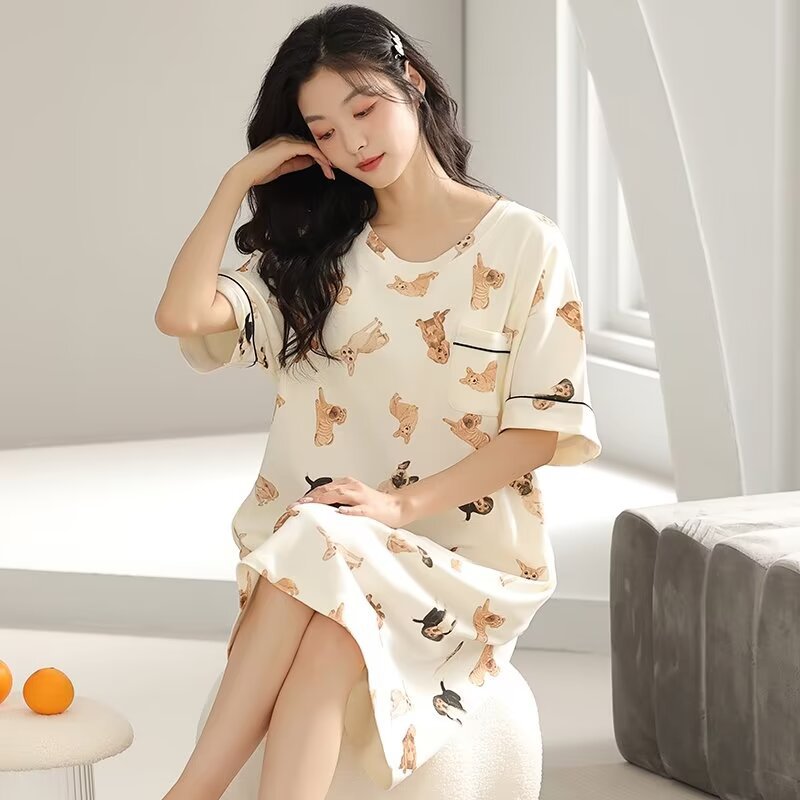 퓨어 코튼 여름 나이트 드레스 요정 스타일 중간 길이 간단한 얇은 브래지어 분리 가능한 만화 반팔 원피스 홈 의류스토어 가기