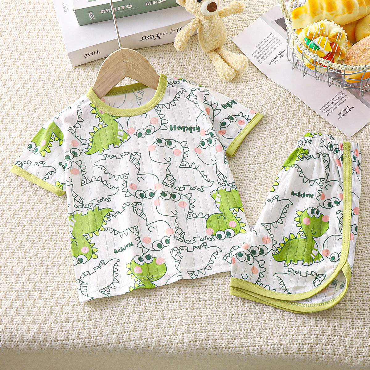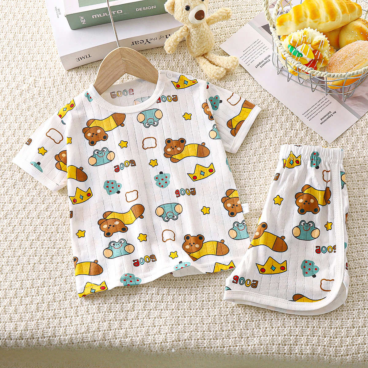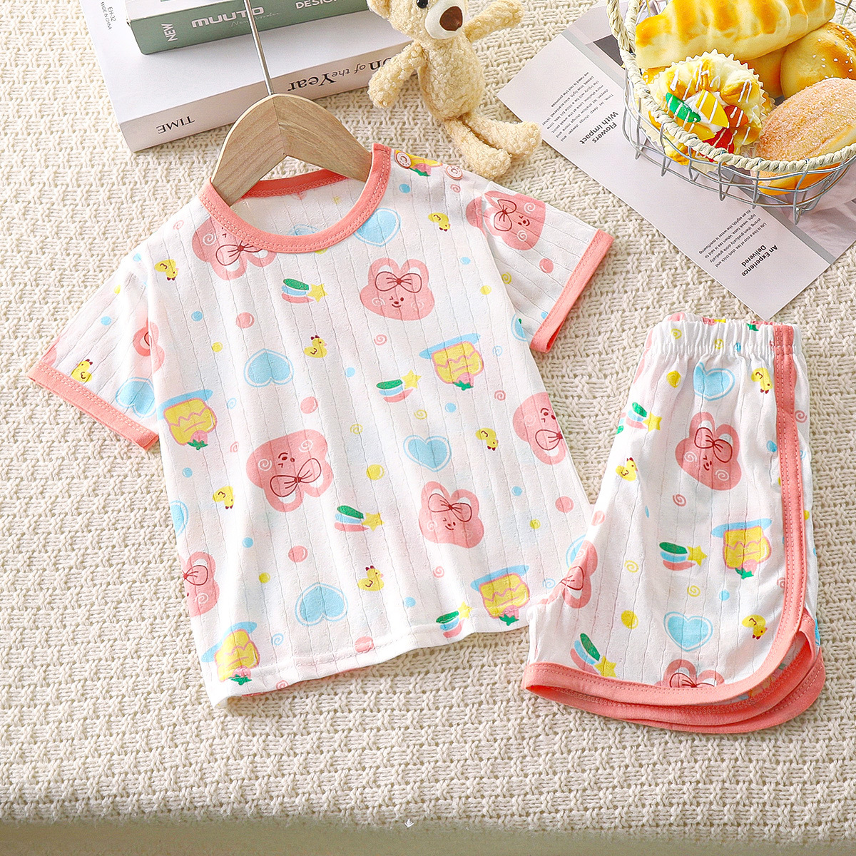 여름 어린이 반팔 반바지 정장 순수 코튼 티셔츠 남성과 여성 아기 얇은 아동 의류 새로운 2024 의류