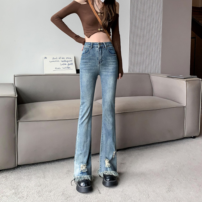 빈티지 향수 프린지 하이 허리 청바지 여성의 2024 가을 새로운 슬림 핏 슬리밍 리핑 마이크로 팬츠