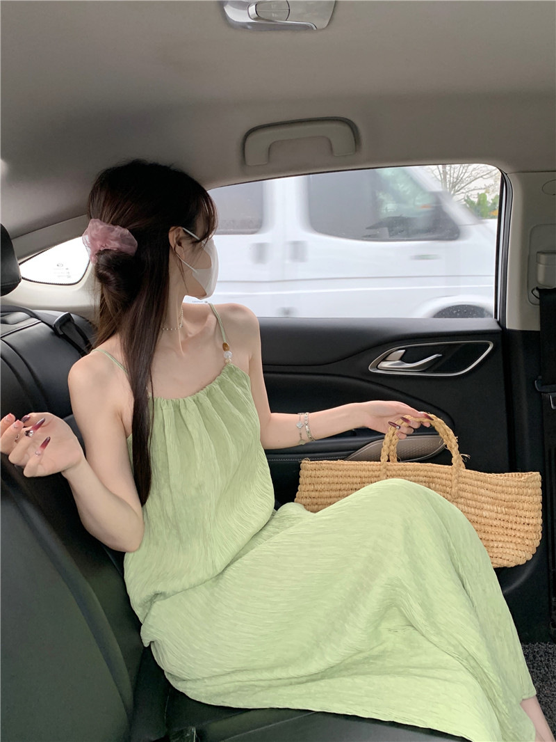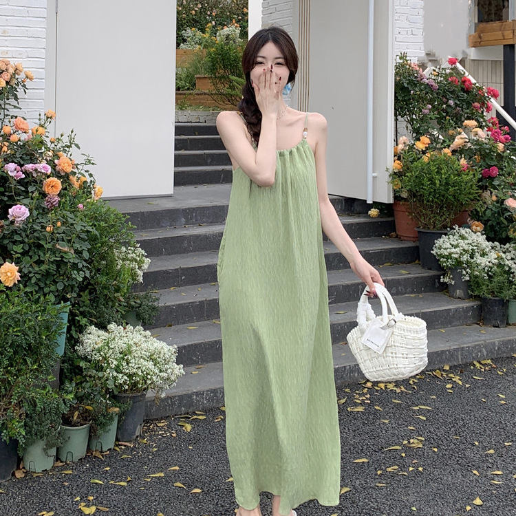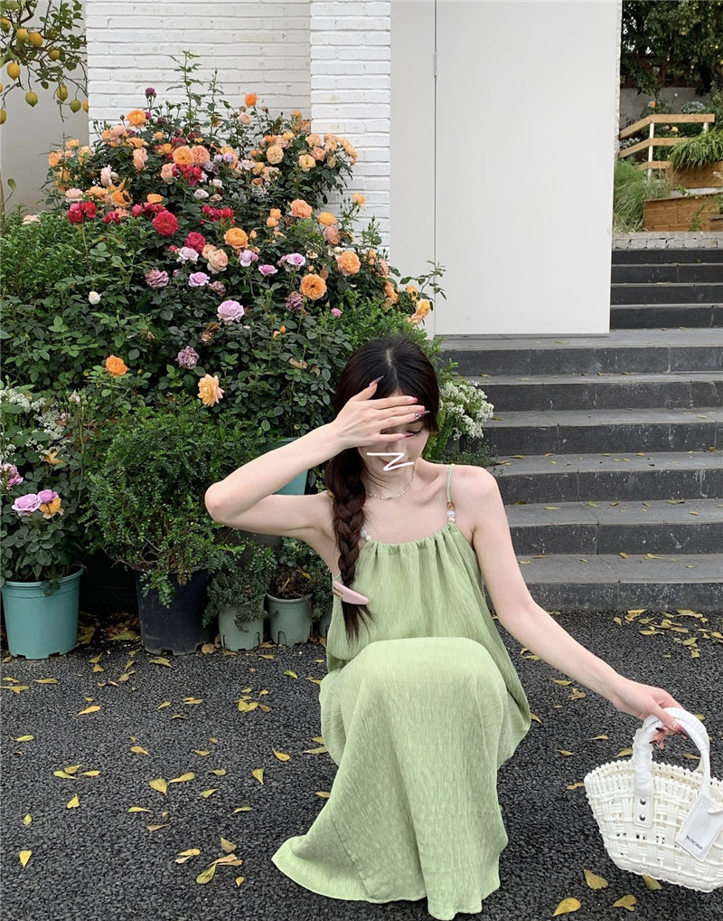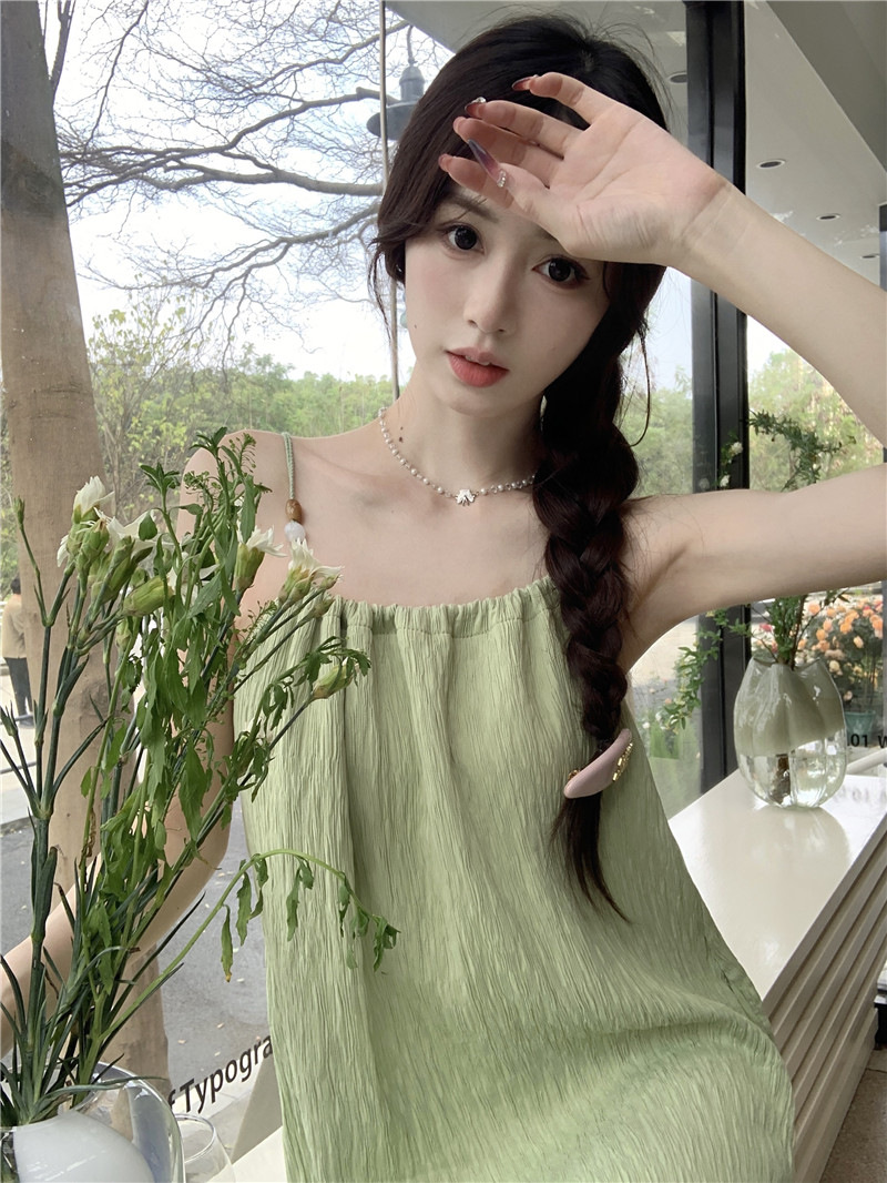 녹색 민소매 조끼 원피스 어린이 여름 2024 새로운 해변 휴가 프랑스 우아한 고급 원피스스토어 가기