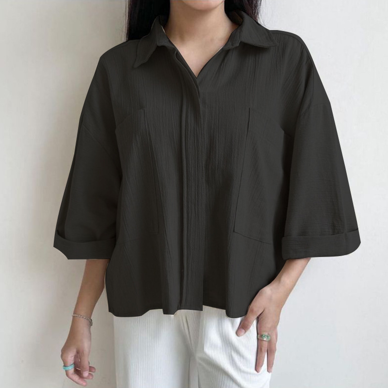 국경 간 아마존, 유럽과 미국 여성의 7 점 슬리브 버튼 단색 느슨한 셔츠 캐주얼 플러스 사이즈 셔츠 여성