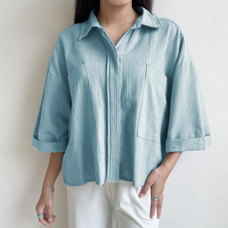 국경 간 아마존, 유럽과 미국 여성의 7 점 슬리브 버튼 단색 느슨한 셔츠 캐주얼 플러스 사이즈 셔츠 여성스토어 가기