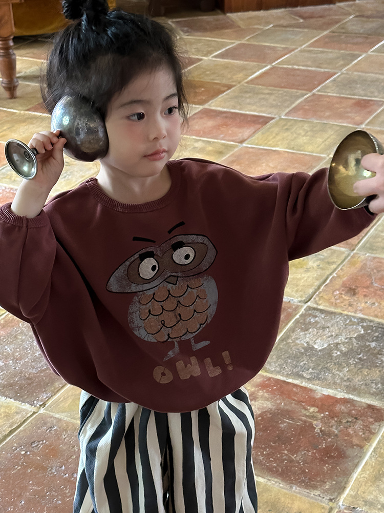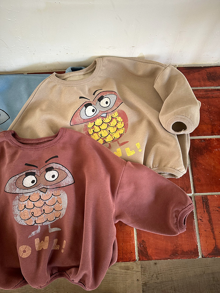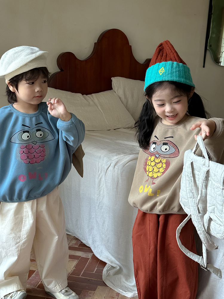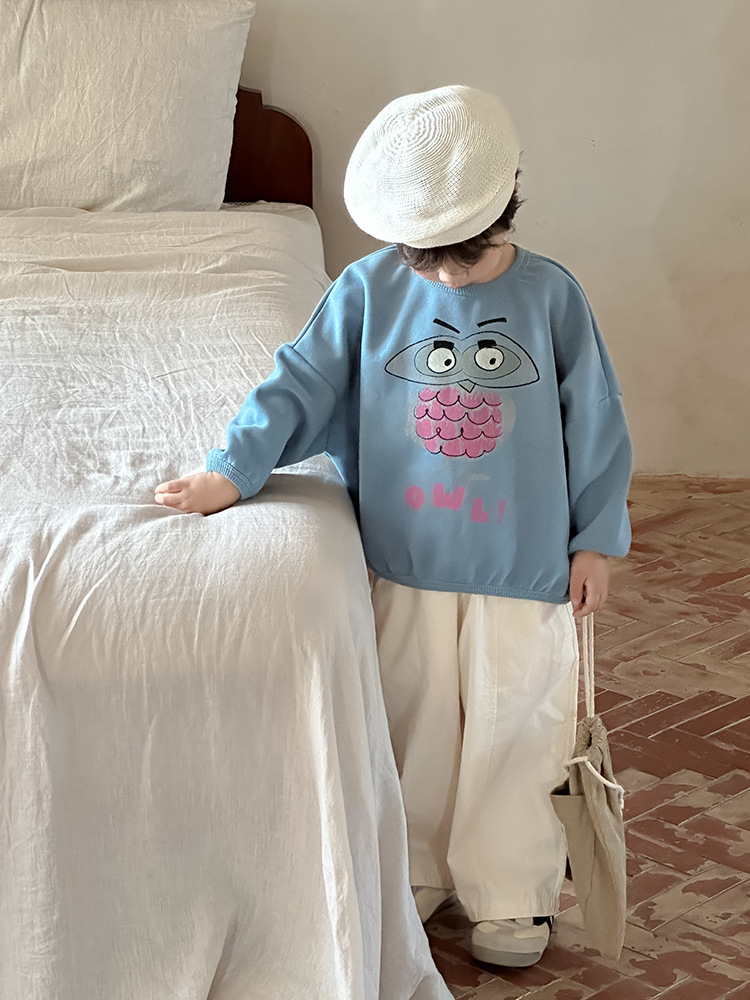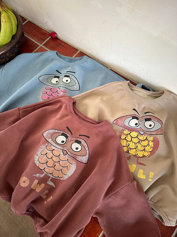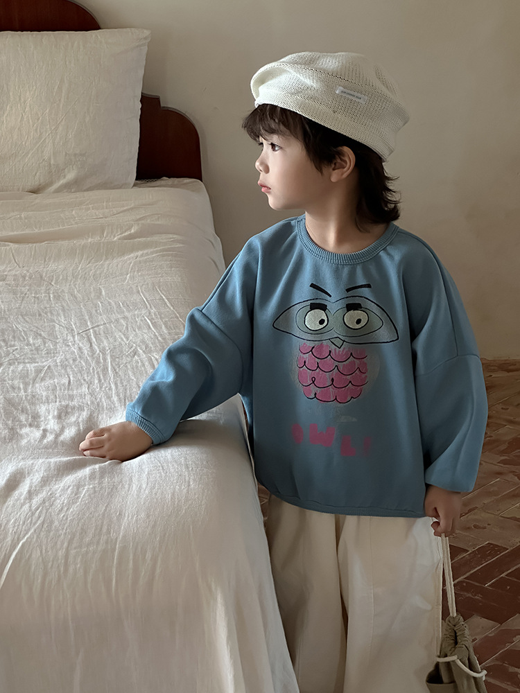어린이 만화 프린트 스웨트 셔츠 2024 가을 새로운 한국 스타일 올빼미 프린트 라운드 넥 긴팔 스웨트 셔츠 소년과 소녀를위한스토어 가기