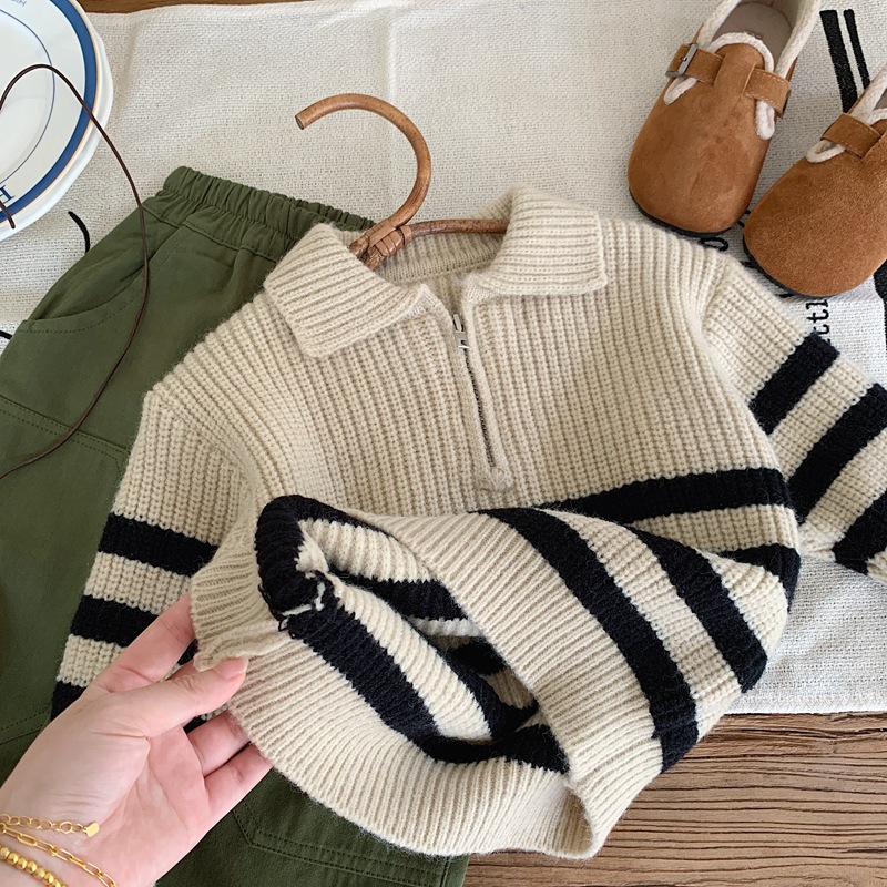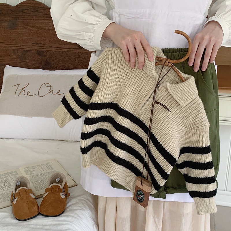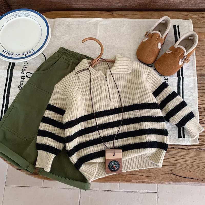 2025 소년 스웨터 풀오버 한국 스타일 가을, 겨울 의류 소년 줄무늬 스웨터 유행 어린이 스웨터 봄, 가을 유행 어린이