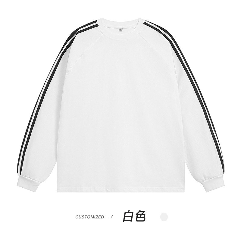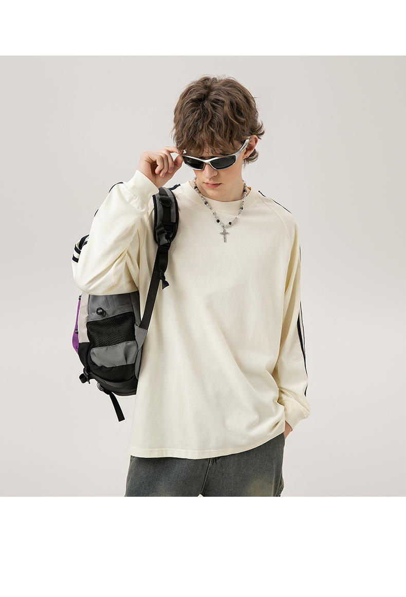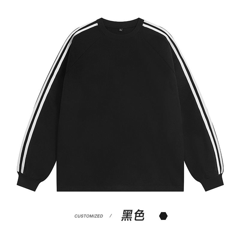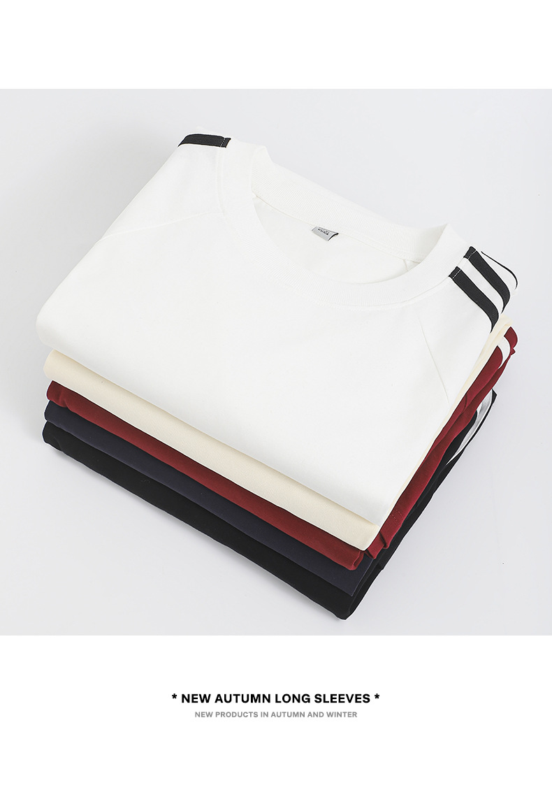 솔리드 컬러 세 줄무늬 250g 무거운 스레드 긴팔 티셔츠 남성용 느슨한 초가을 컬러 차단 라글란 라운드 넥 바닥 셔츠