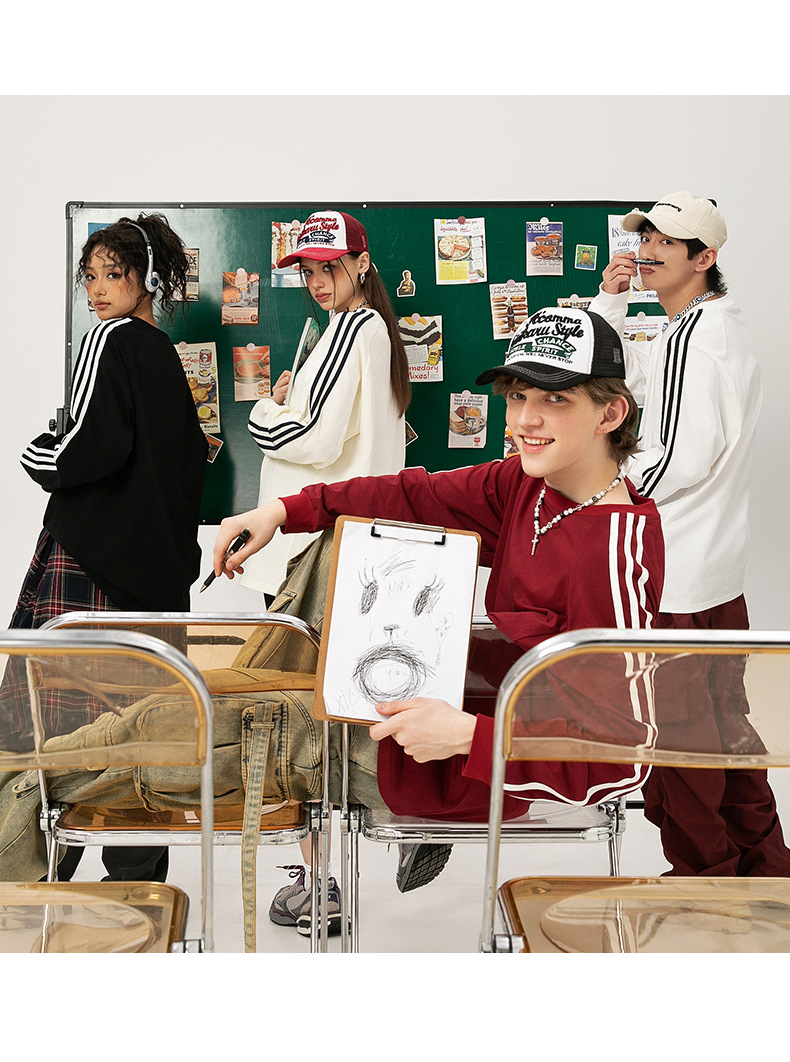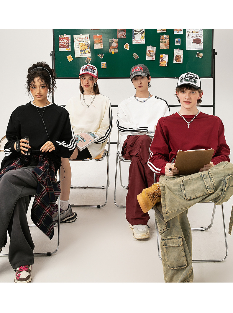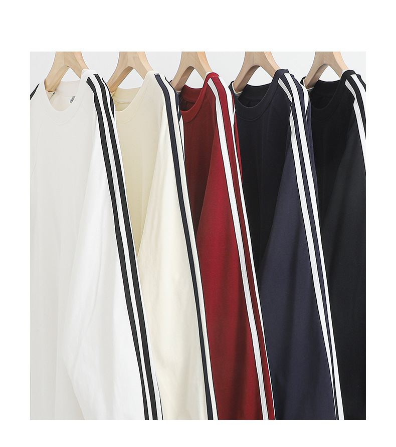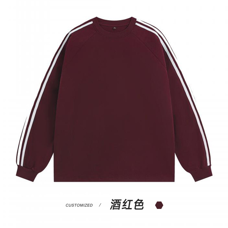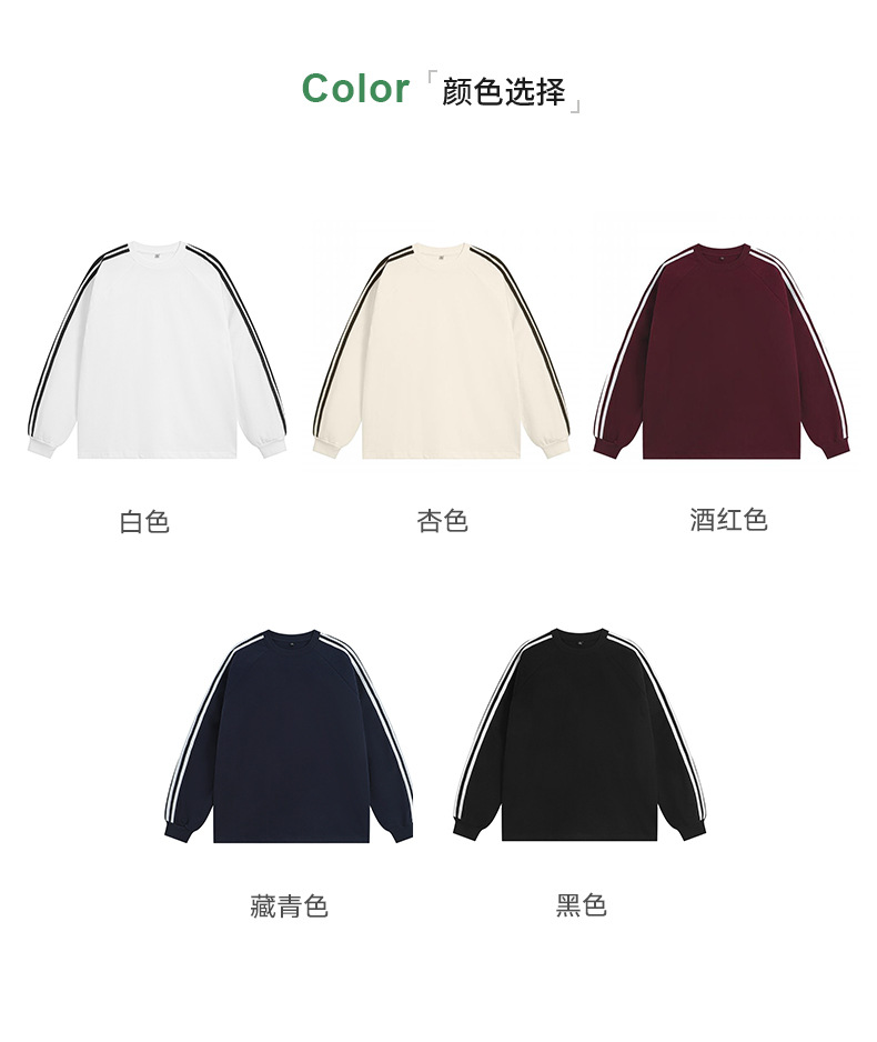 솔리드 컬러 세 줄무늬 250g 무거운 스레드 긴팔 티셔츠 남성용 느슨한 초가을 컬러 차단 라글란 라운드 넥 바닥 셔츠