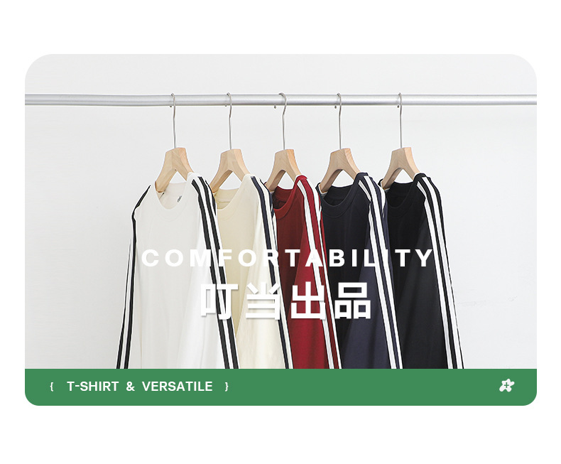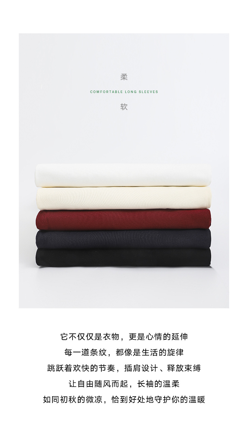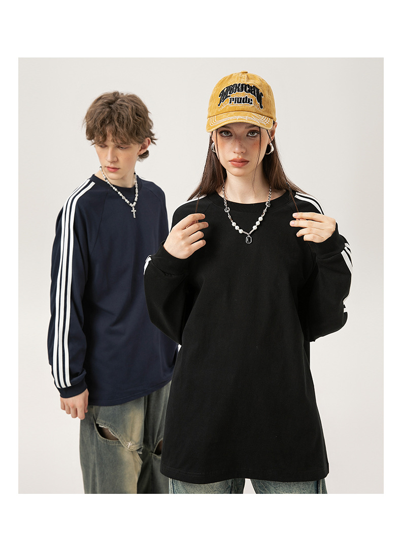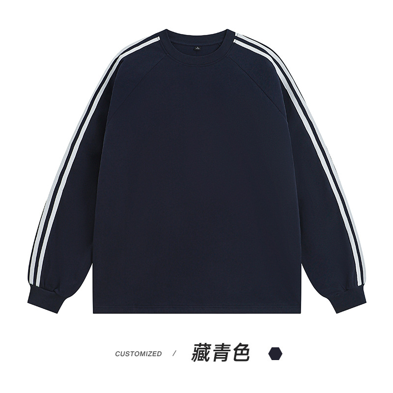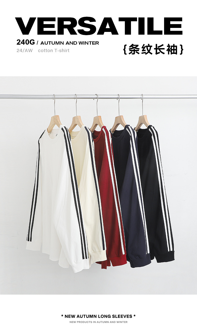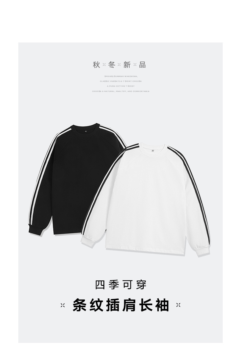 솔리드 컬러 세 줄무늬 250g 무거운 스레드 긴팔 티셔츠 남성용 느슨한 초가을 컬러 차단 라글란 라운드 넥 바닥 셔츠스토어 가기