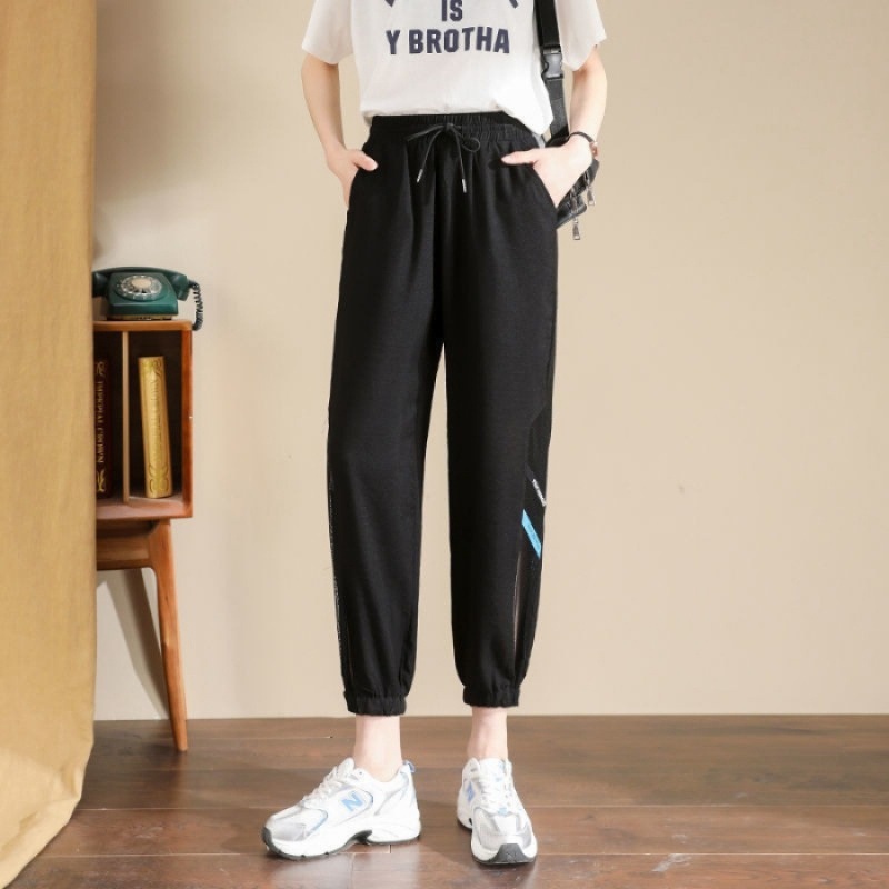 2023 새로운 아이스 실크 블랙 메쉬 캐주얼 스웨트 팬츠 여성의 여름 얇은 다리 발가락 느슨한 빠른 건조 자른 스포츠 바지
