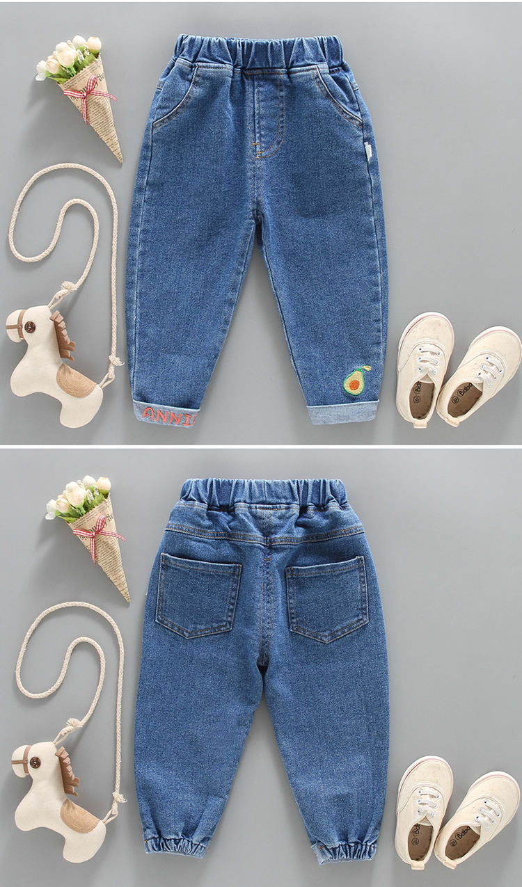 소녀 바지 봄과 가을 2024 새로운 세련된 어린이 플립 딸기 올 매치 패션 한국 청바지 아기 소녀