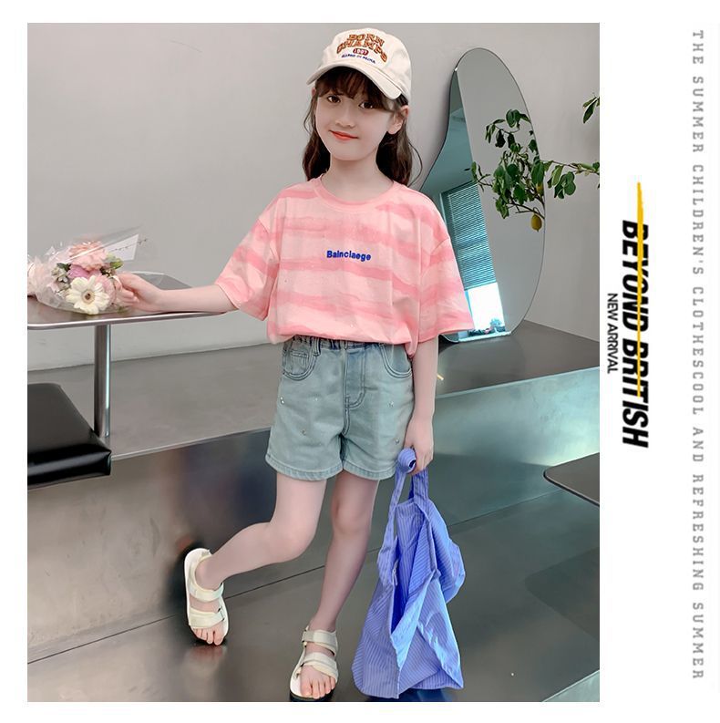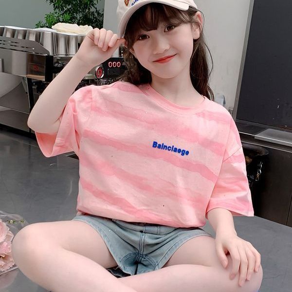 여자 반팔 티셔츠 2024 새로운 스타일 여름 어린이 온라인 인기 서양식 올 매치 코튼 티셔츠 걸스 여름 최고 트렌디스토어 가기