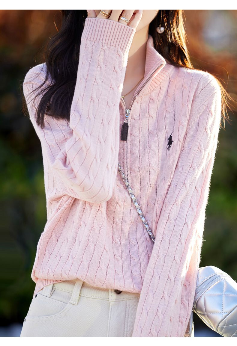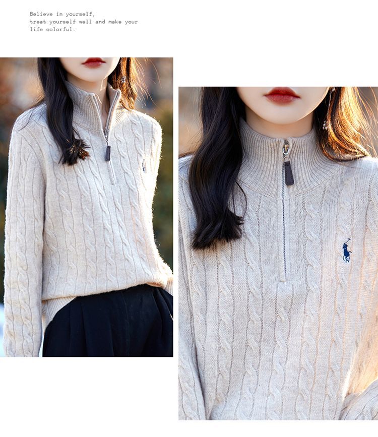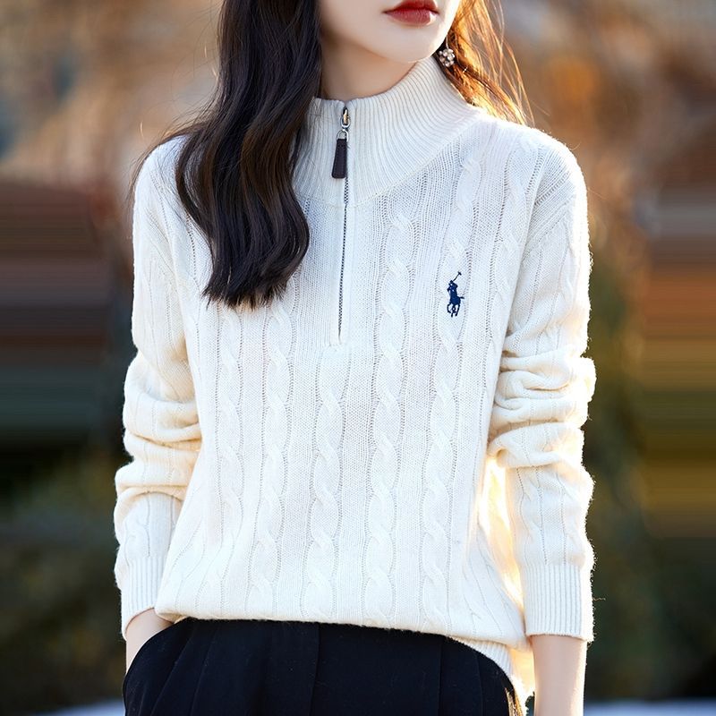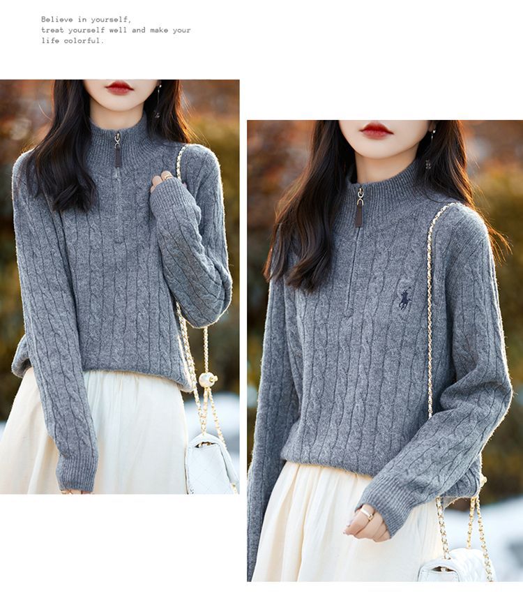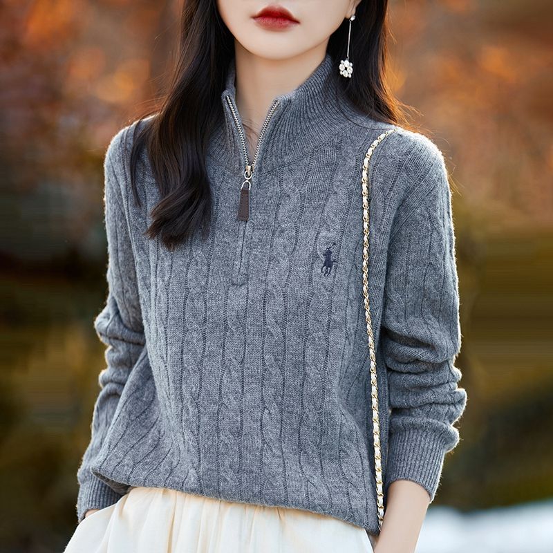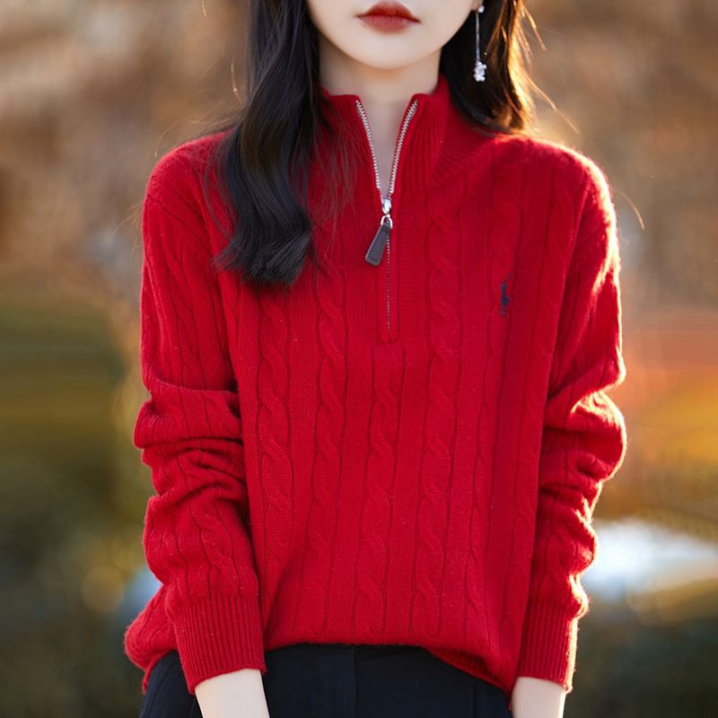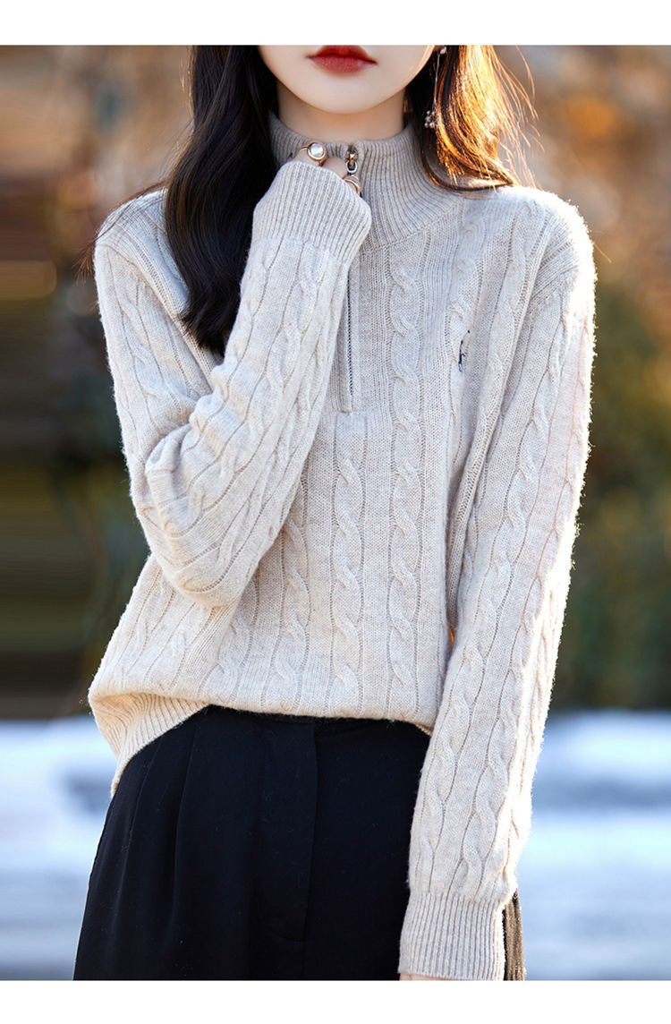 【양모】단색 캐시미어 여성용 가을 겨울 스탠드 칼라 지퍼 스웨터 루즈핏 이너웨어 두꺼운 울 베이스 셔츠