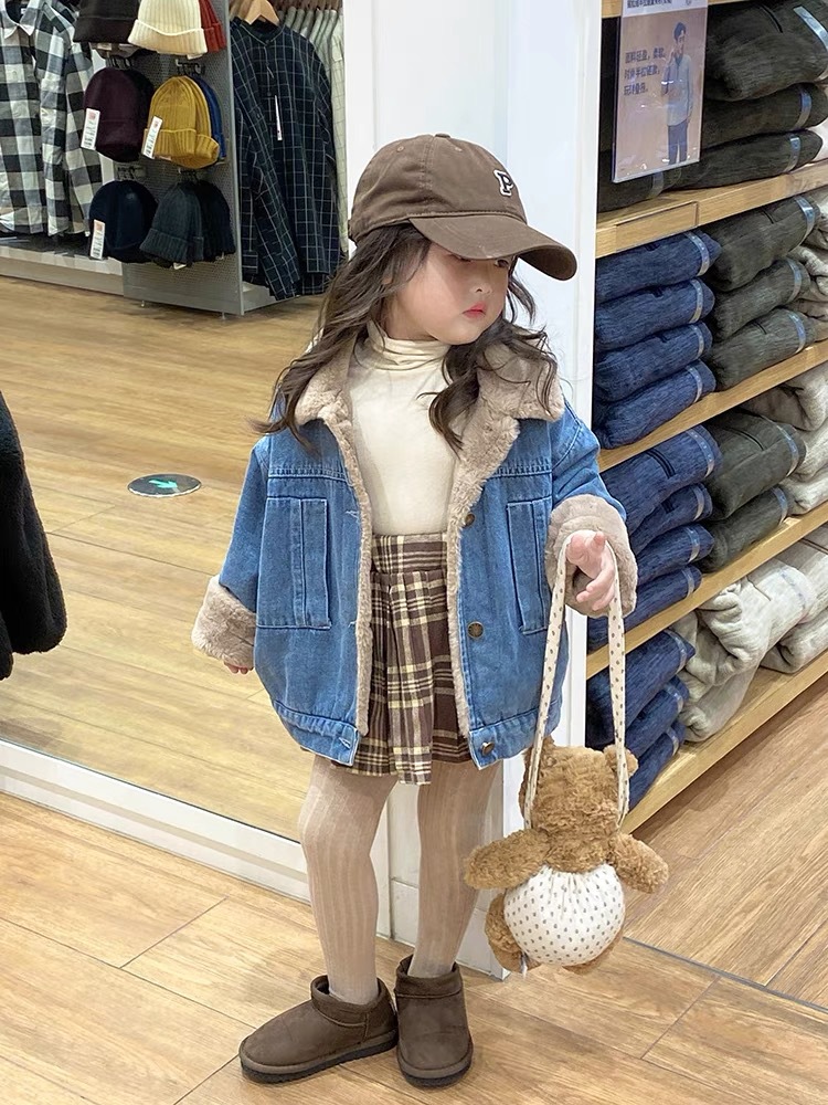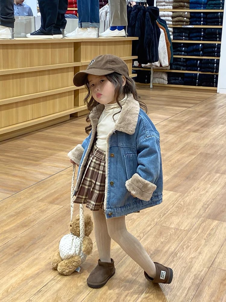 2025 겨울 신상 한국 스타일 아동복 여아용 따뜻한 플리스 데님 재킷, 세련된 영국식 카디건스토어 가기