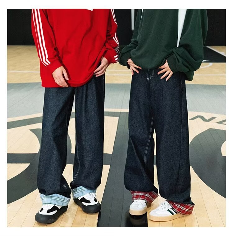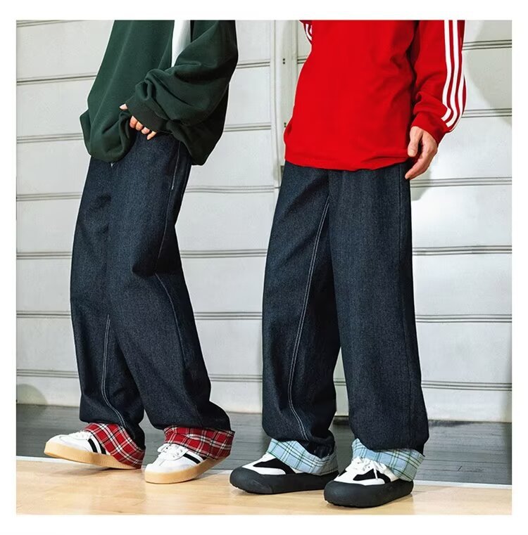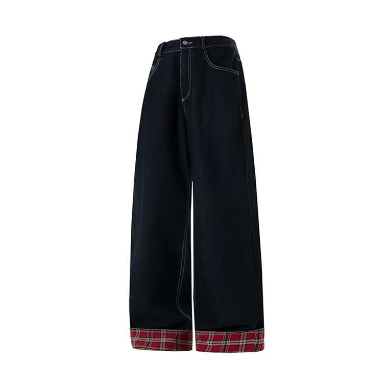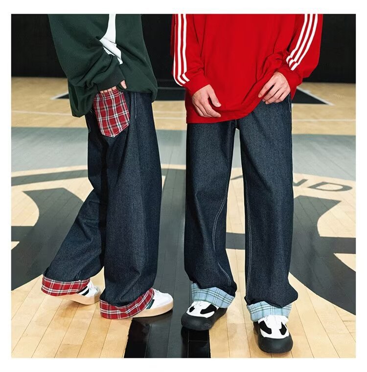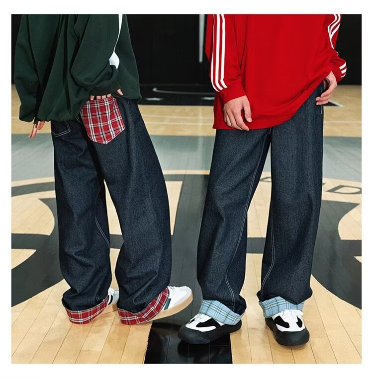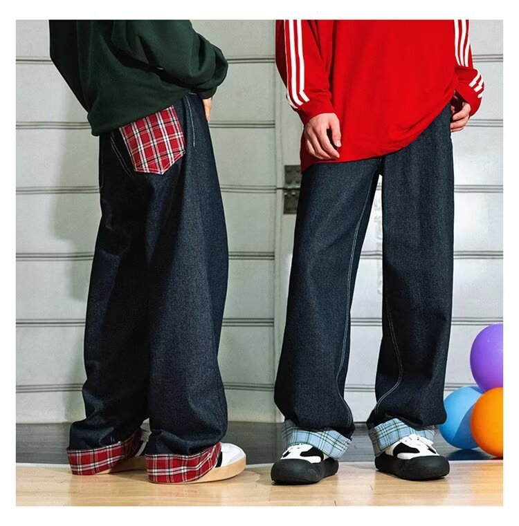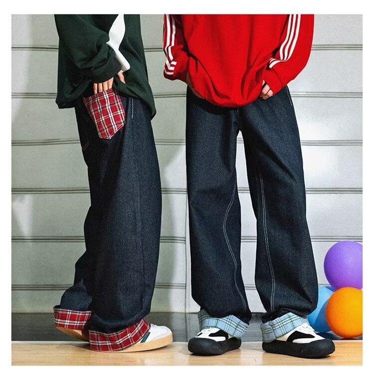 미국식 체크 패치워크 데님 팬츠 남성용 롤업 루즈핏 스트레이트 팬츠 긴바지 레트로 팬츠 여성용 레트로 데님 팬츠