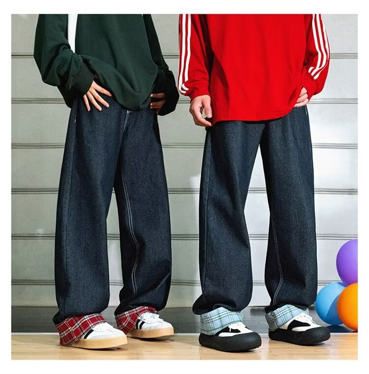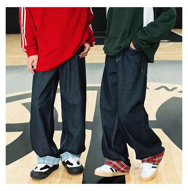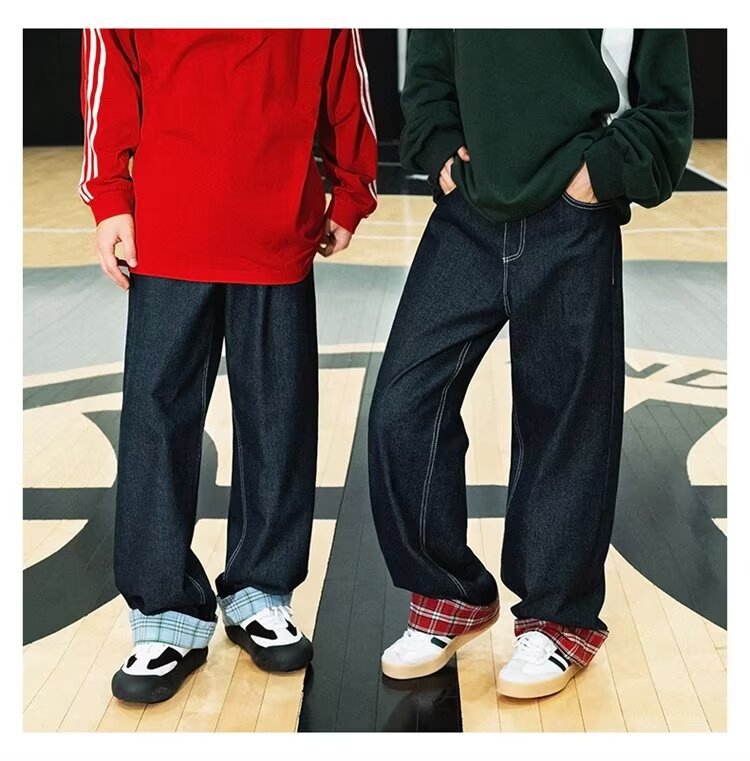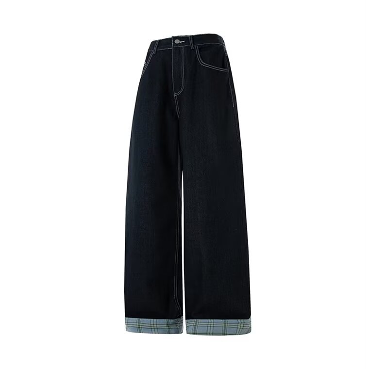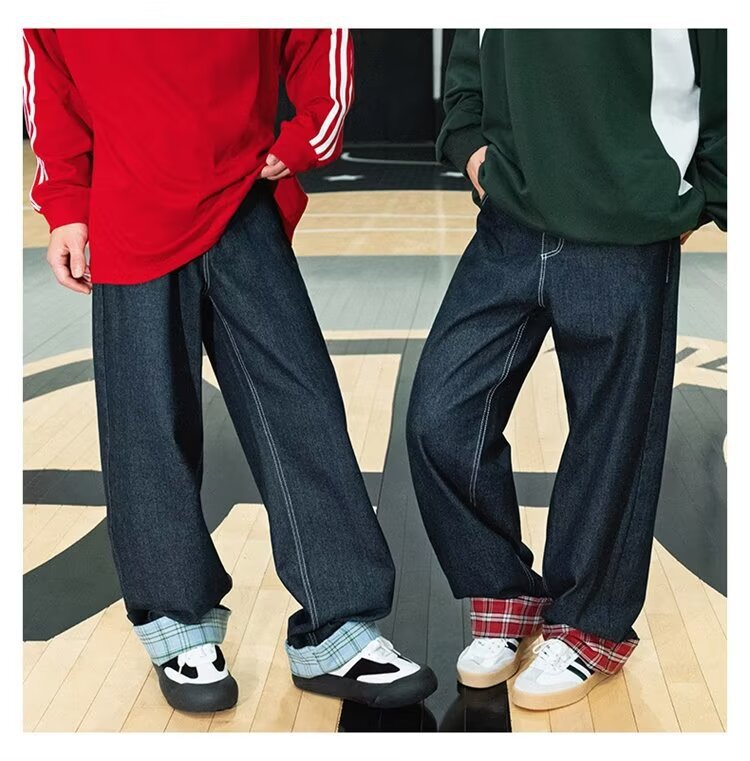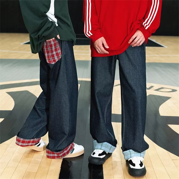 미국식 체크 패치워크 데님 팬츠 남성용 롤업 루즈핏 스트레이트 팬츠 긴바지 레트로 팬츠 여성용 레트로 데님 팬츠