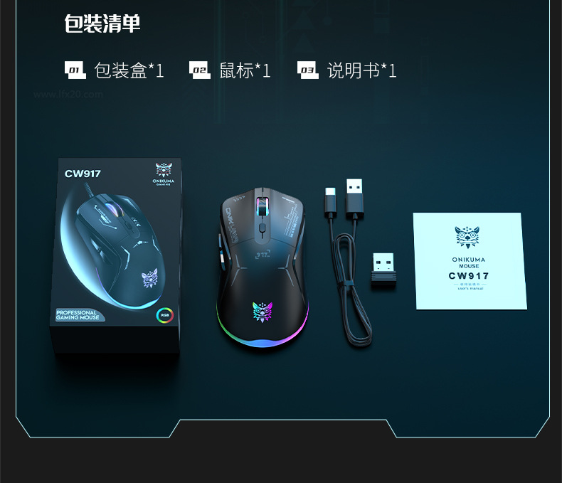 국경 간 새로운 ONIKUMA CW917 2.4G 듀얼 모드 마우스 사무실 컴퓨터 USB 다채로운 RGB스토어 가기