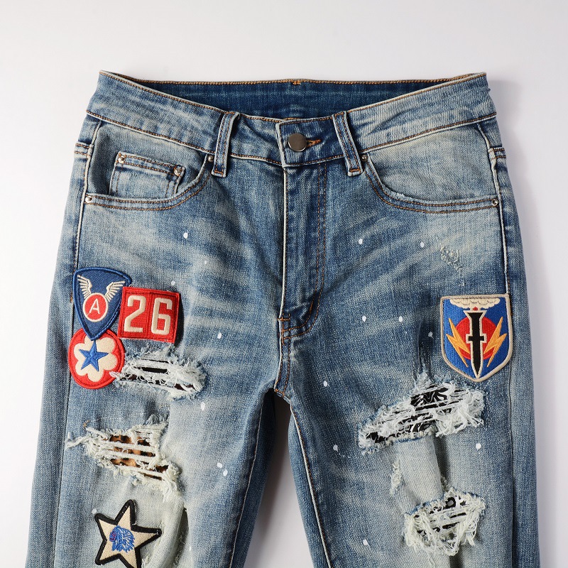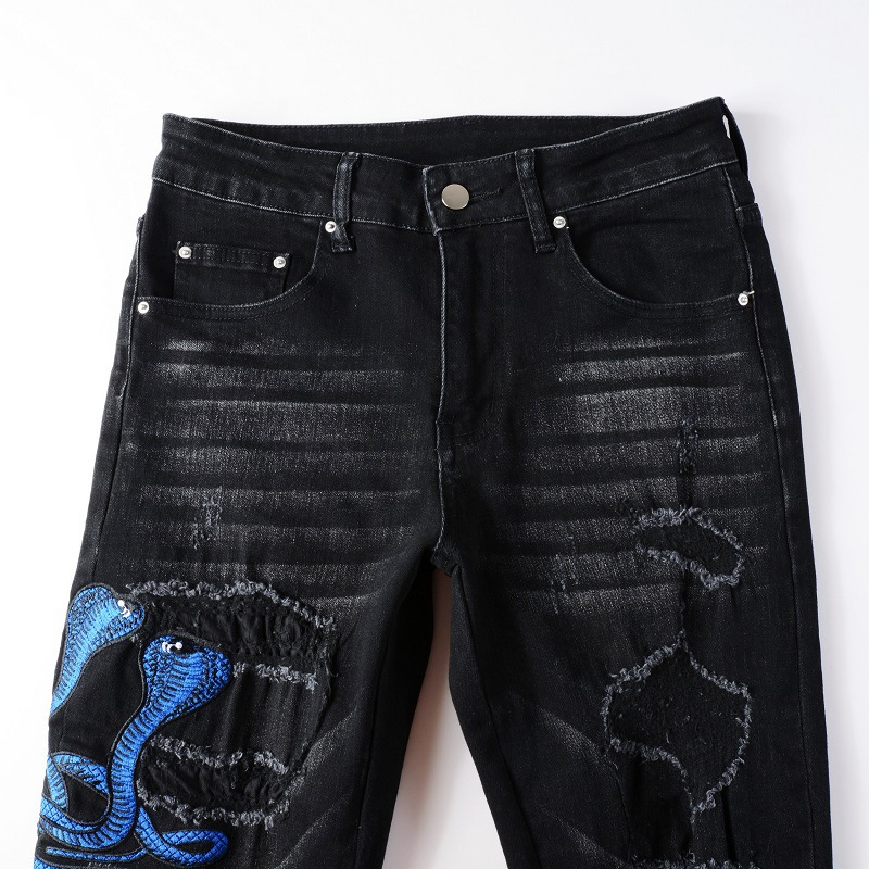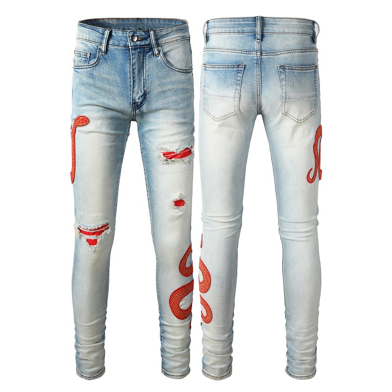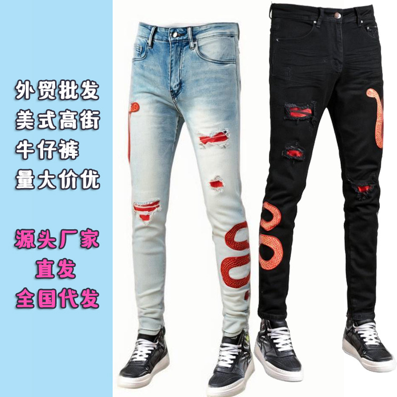 스트리트 스타일 유럽 및 미국 남성용 자수 뱀 패턴 청바지 남성 슬림핏 바지스토어 가기