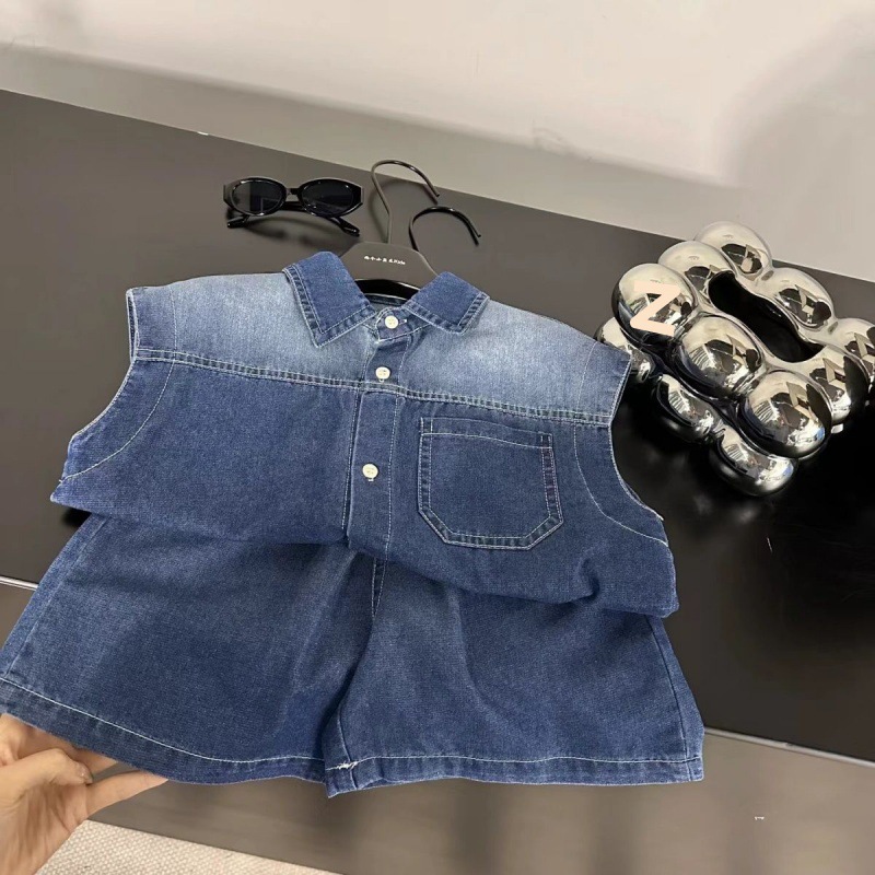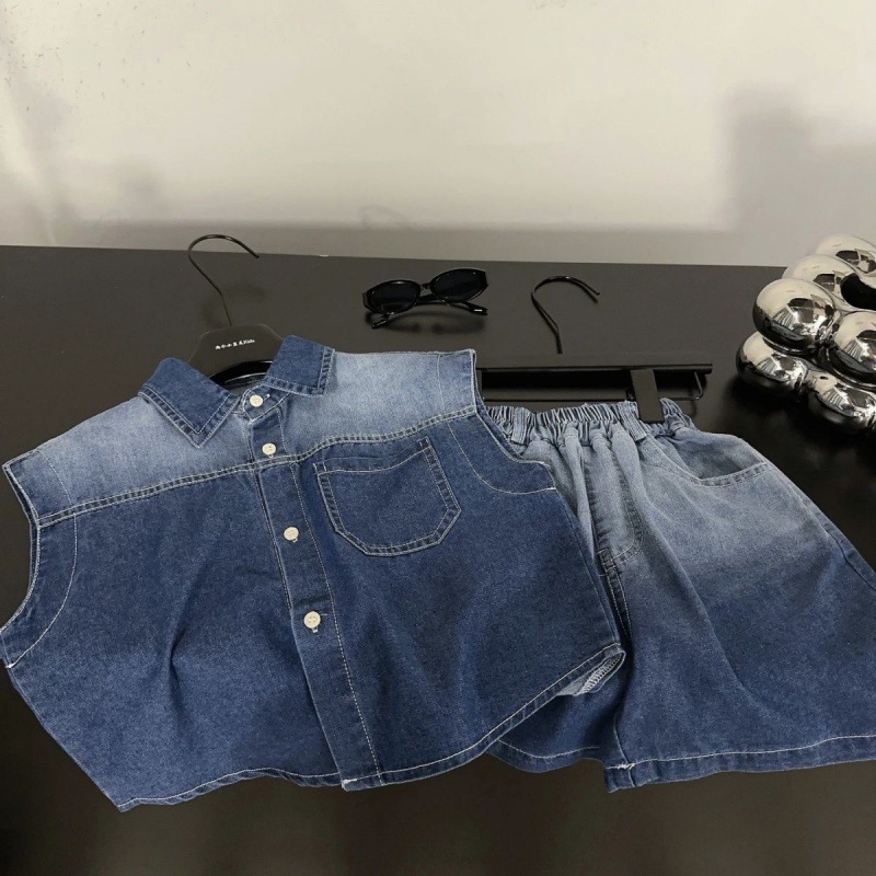 어린이 여름 부드러운 데님 세트 2024 새로운 유행 잘 생긴 튀김 거리 그라디언트 민소매 셔츠 반바지 투피스 세트