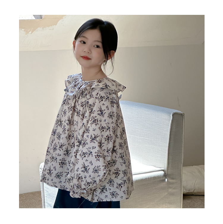꽃과 Xun 소녀 셔츠 2024 가을 새로운 어린이 한국 스타일 꽃 옷깃 아기 인형 탑 아기 셔츠