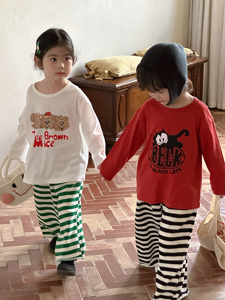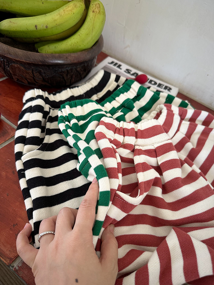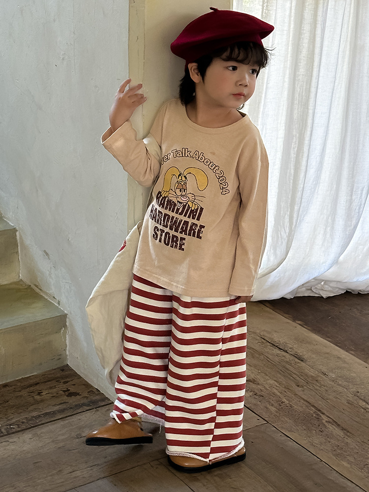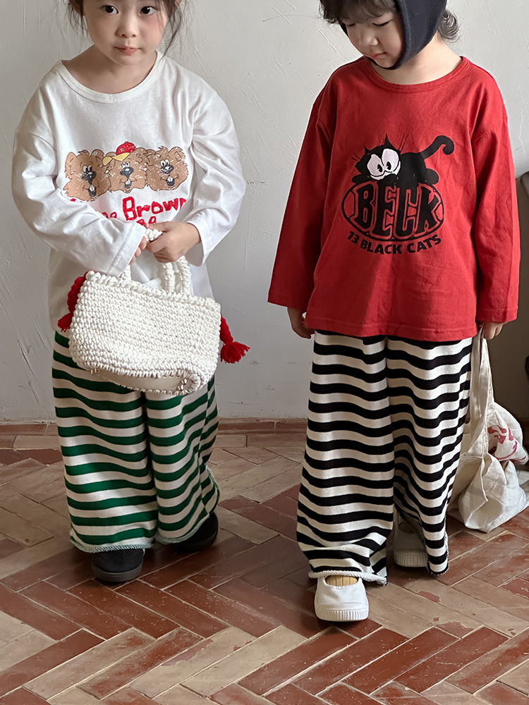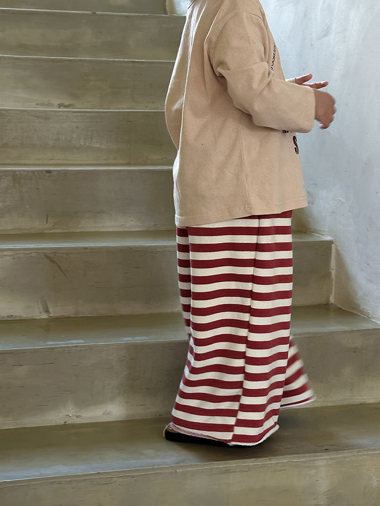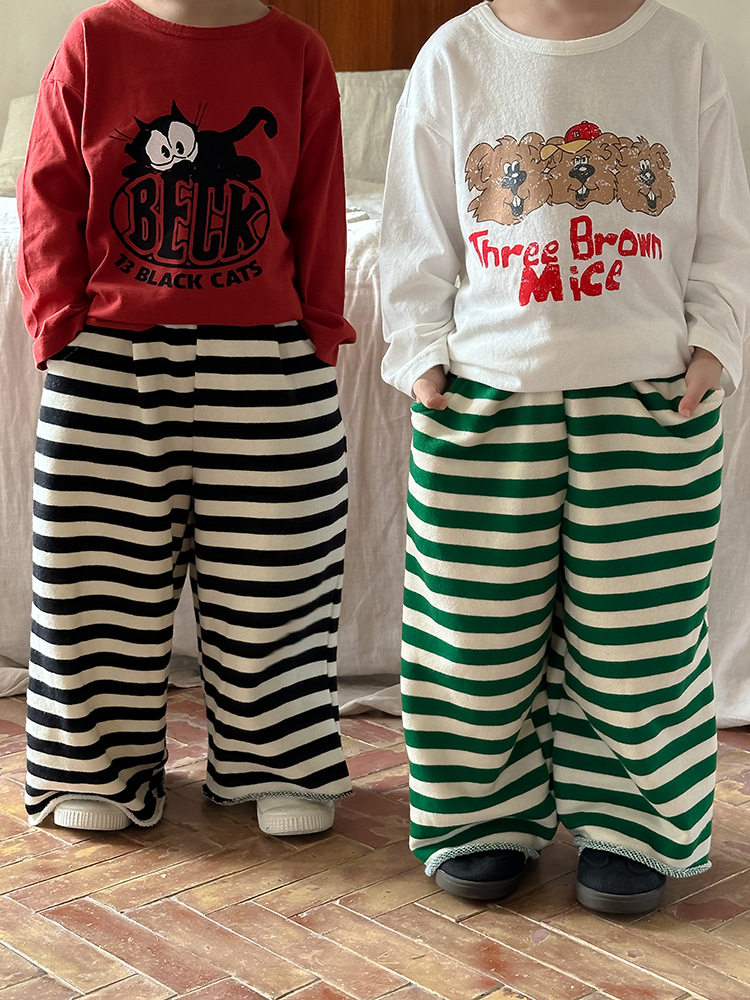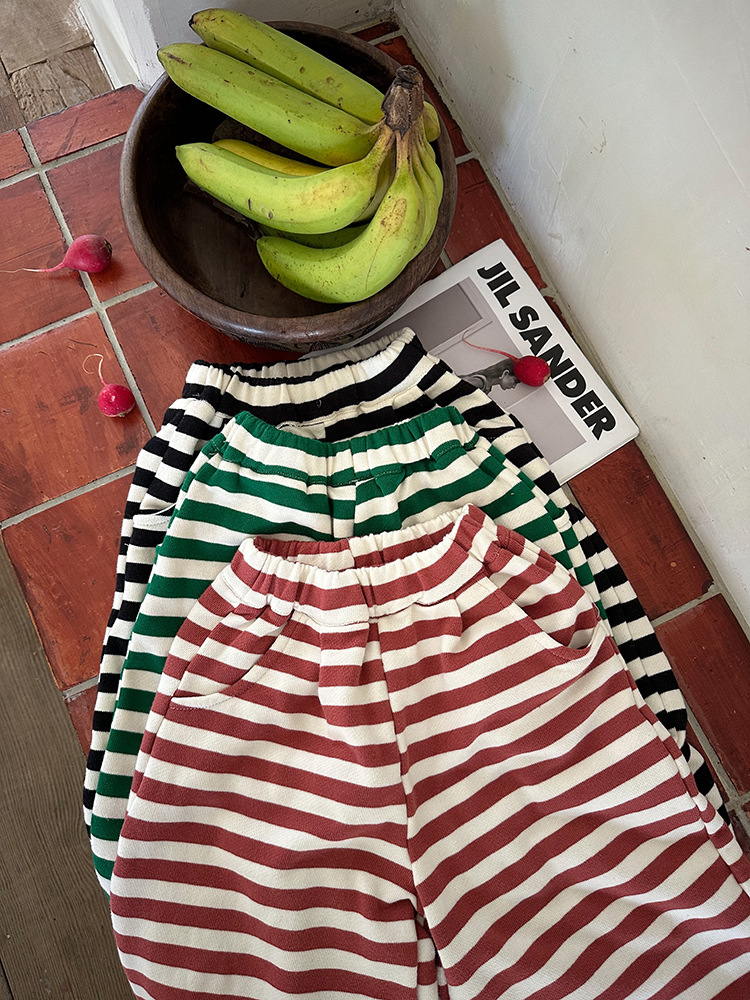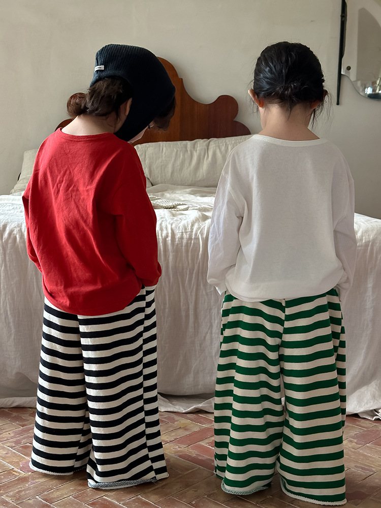 Zuoxiaoran 아동복 아동 스트라이프 와이드 팬츠 2024 가을 신작 한국 스타일 스트라이프 3색 바닥 길이 바지 소년 소녀용스토어 가기