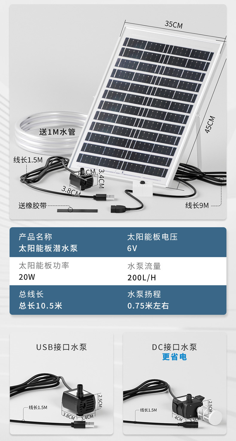 • 6V20W 보드 + USB 워터 펌프(USB 인터페이스 케이블 10m )
