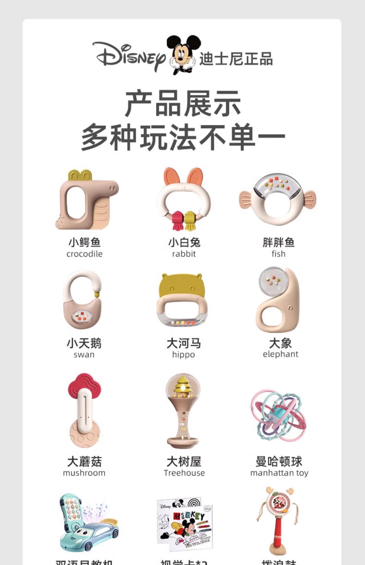 • [치발기 10개 + 비주얼카드 + 딸랑이 + 자동차 조기교육기 + 미키 컴포트 타올 + 핸드볼 + 천책]