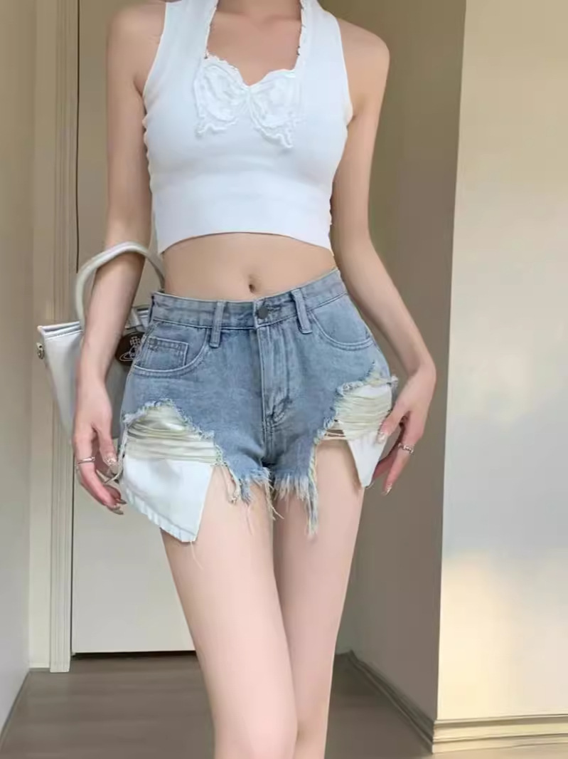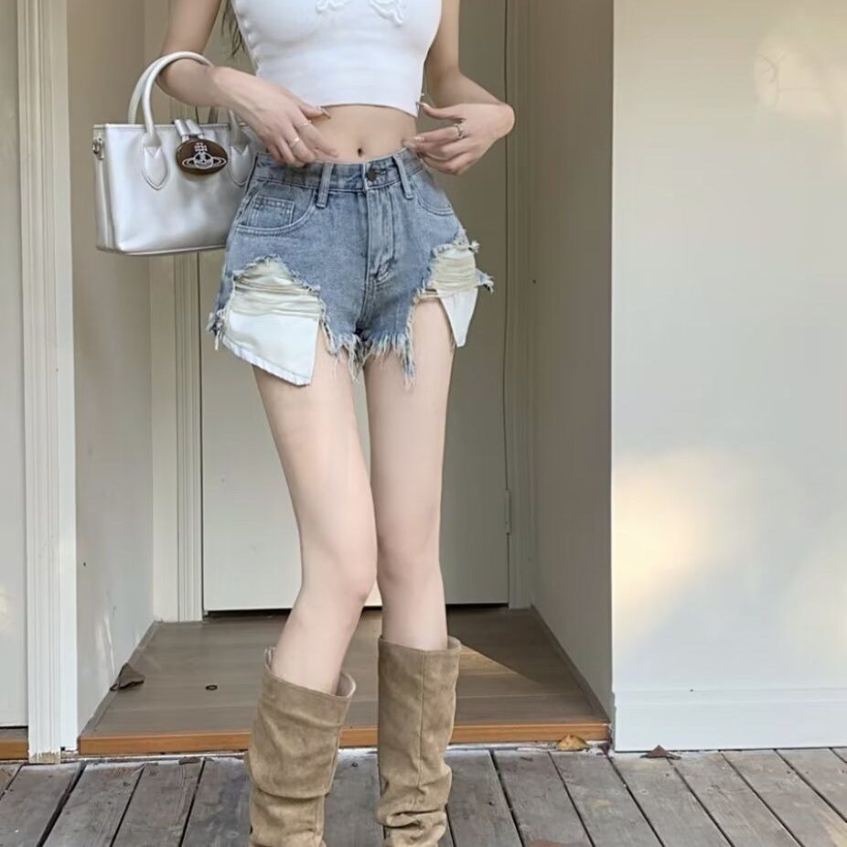 뜨거운 소녀 찢어진 술 랩 청바지 여자 여름 2024 새로운 모든 경기 캐주얼 높은 허리 슬리밍 넓은 다리 반바지스토어 가기