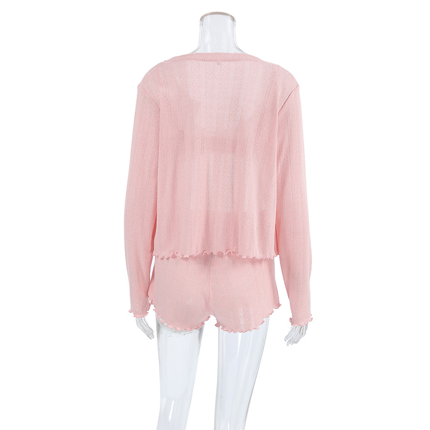 유럽과 미국 스타일의 새로운 봄 니트 스킨 친화적 인 긴팔 카디건 속옷 반바지 3 피스 디자인 감각 통기성 파자마스토어 가기