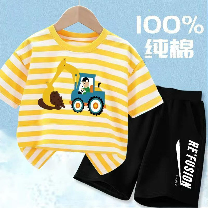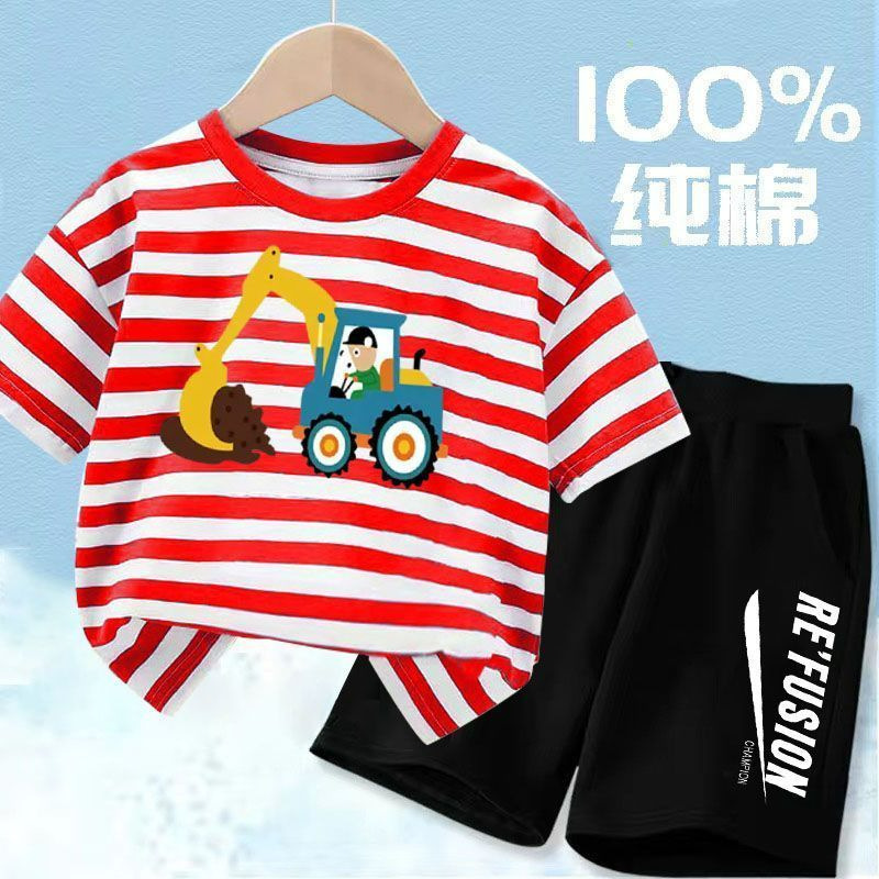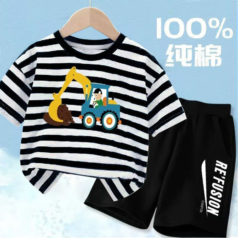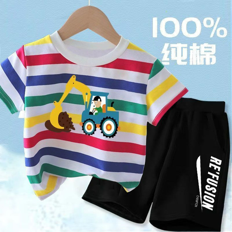 2024 여름 새로운 코튼 스트라이프 짧은 소매 세트 소년과 소녀 짧은 바지 투피스 아기 여름 복장