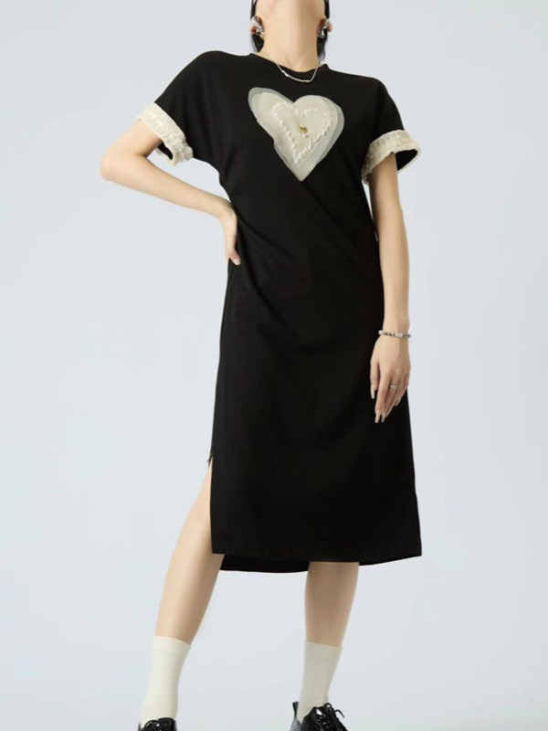 블랙 크루 넥 티셔츠 원피스 2024 여름 새로운 느슨한 슬리밍 미디 원피스