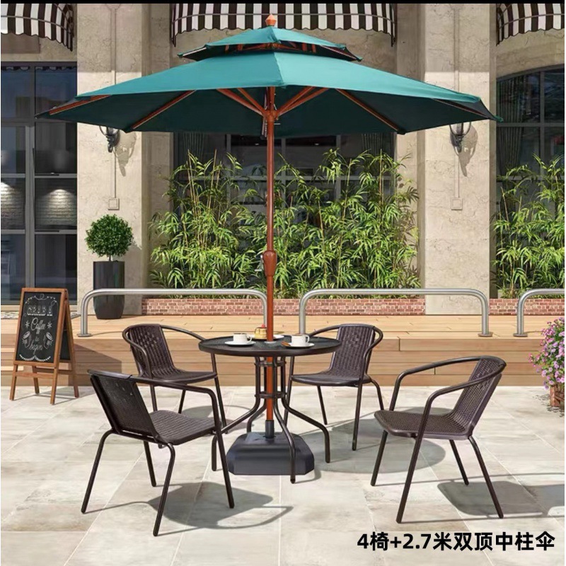 야외 테이블과 의자 우산 조합 햇빛 야외 야외 야외 우유 차 커피 숍 캐주얼 철 야외 등나무 의자