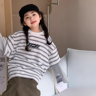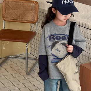 女童假两件长袖T恤春秋款2024新款中大童圆领套头宽松休闲上衣潮