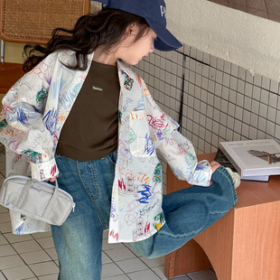 女童长袖衬衫秋装2024新款洋气大童涂鸦中长款上衣儿童衬衣娃娃衫