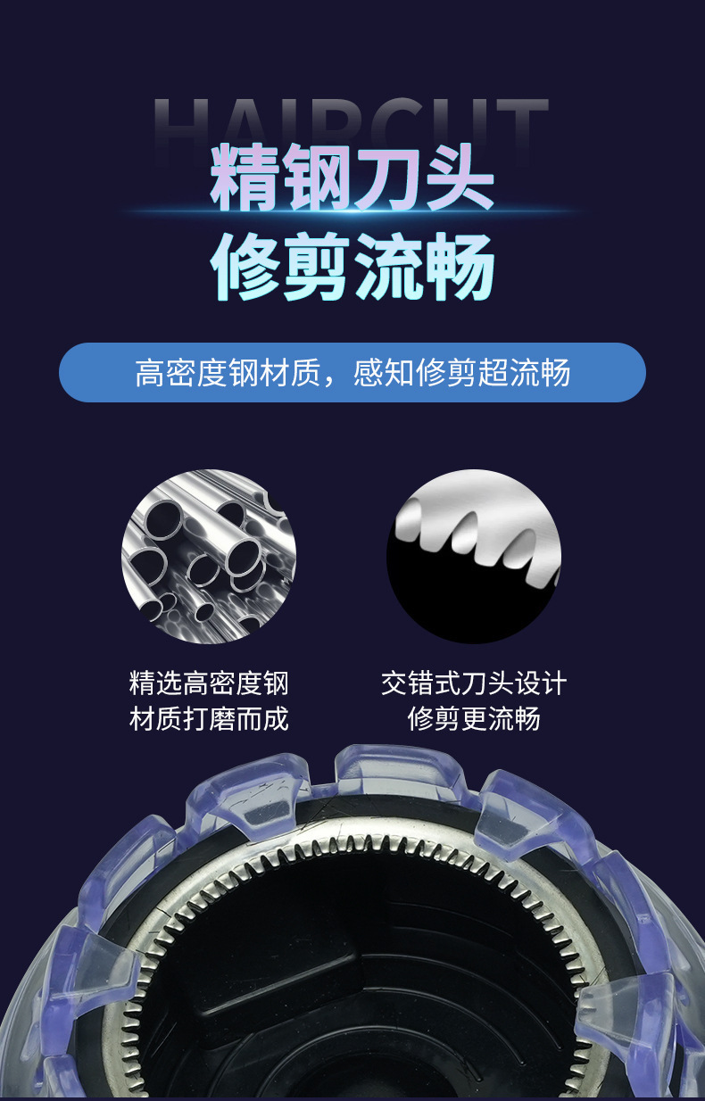 产品配件:彩盒包装+说明书(中英文)+限位梳*2(1号3/6/9.5mm,2号12mm) +USB充电线+润滑油+清洁刷