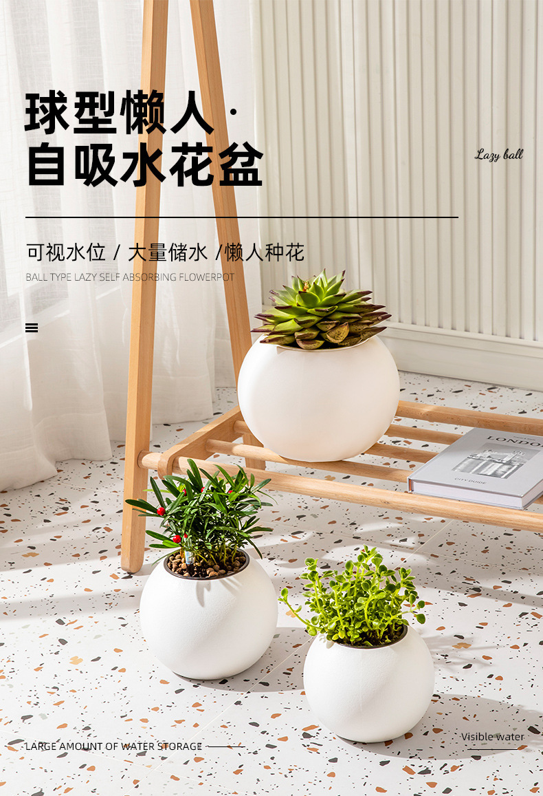 창조적 인 구형 화분 배꼽 냄비 흰색 큰 화분 비 다공성 수경 용기 게으른 자동 흡수성 플라스틱 제조 업체