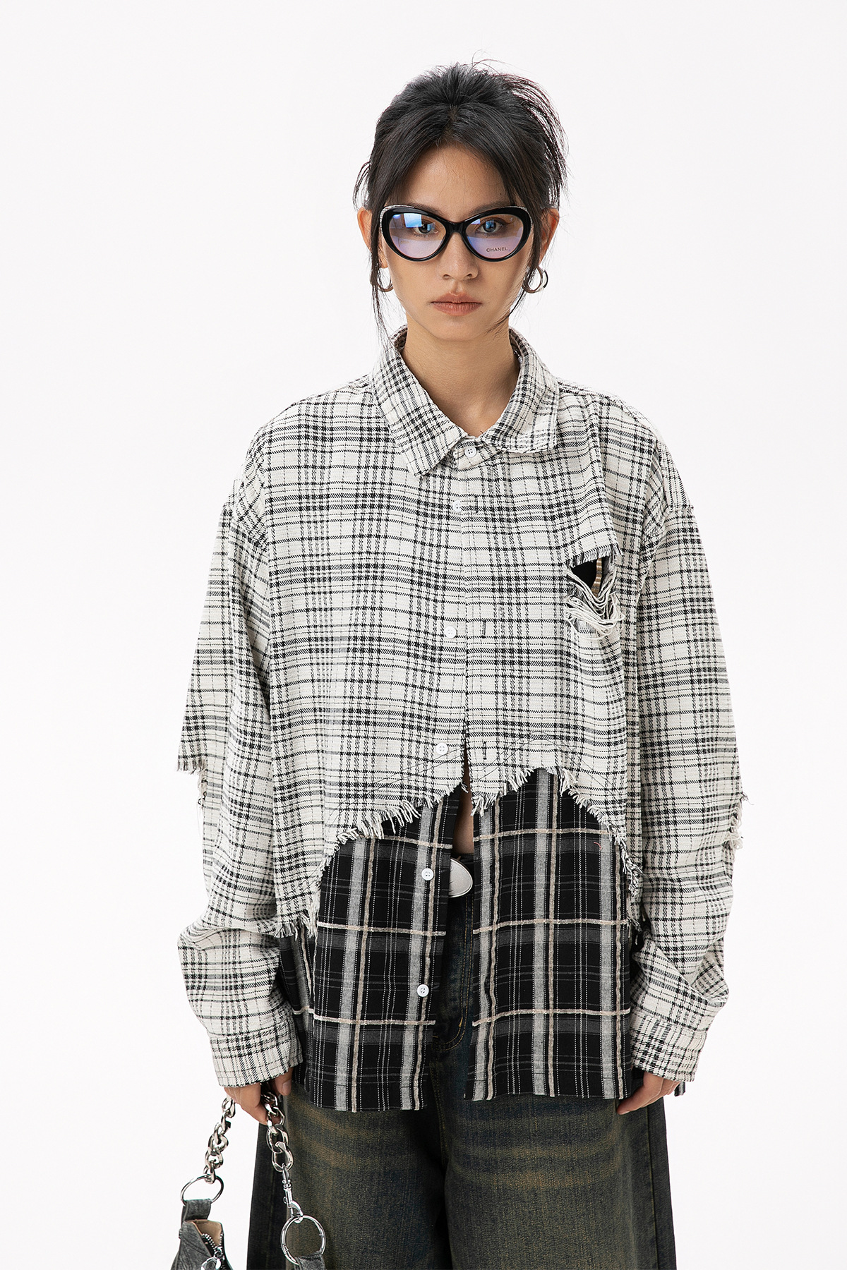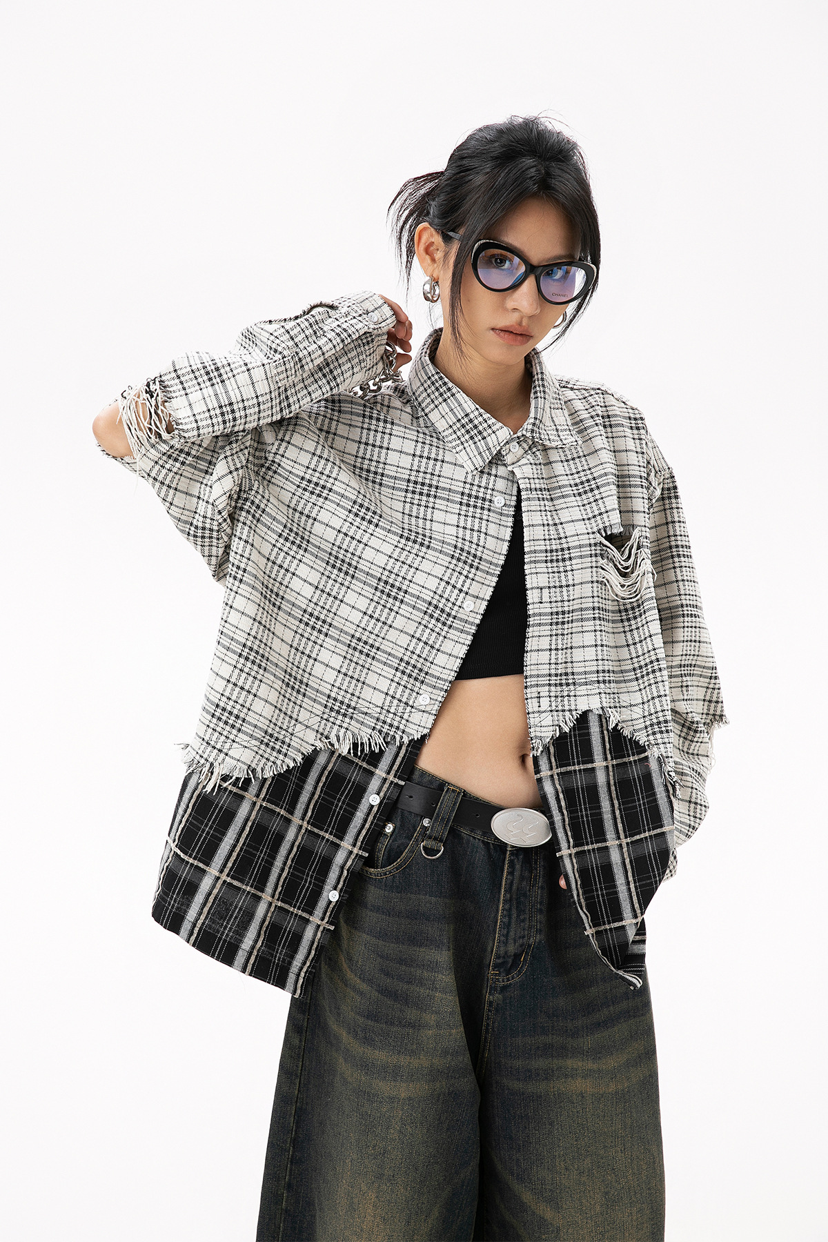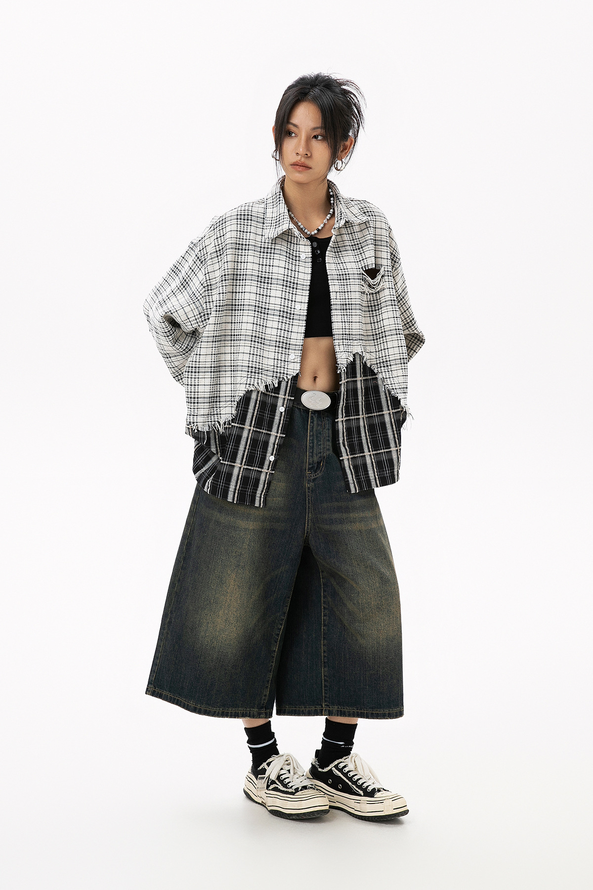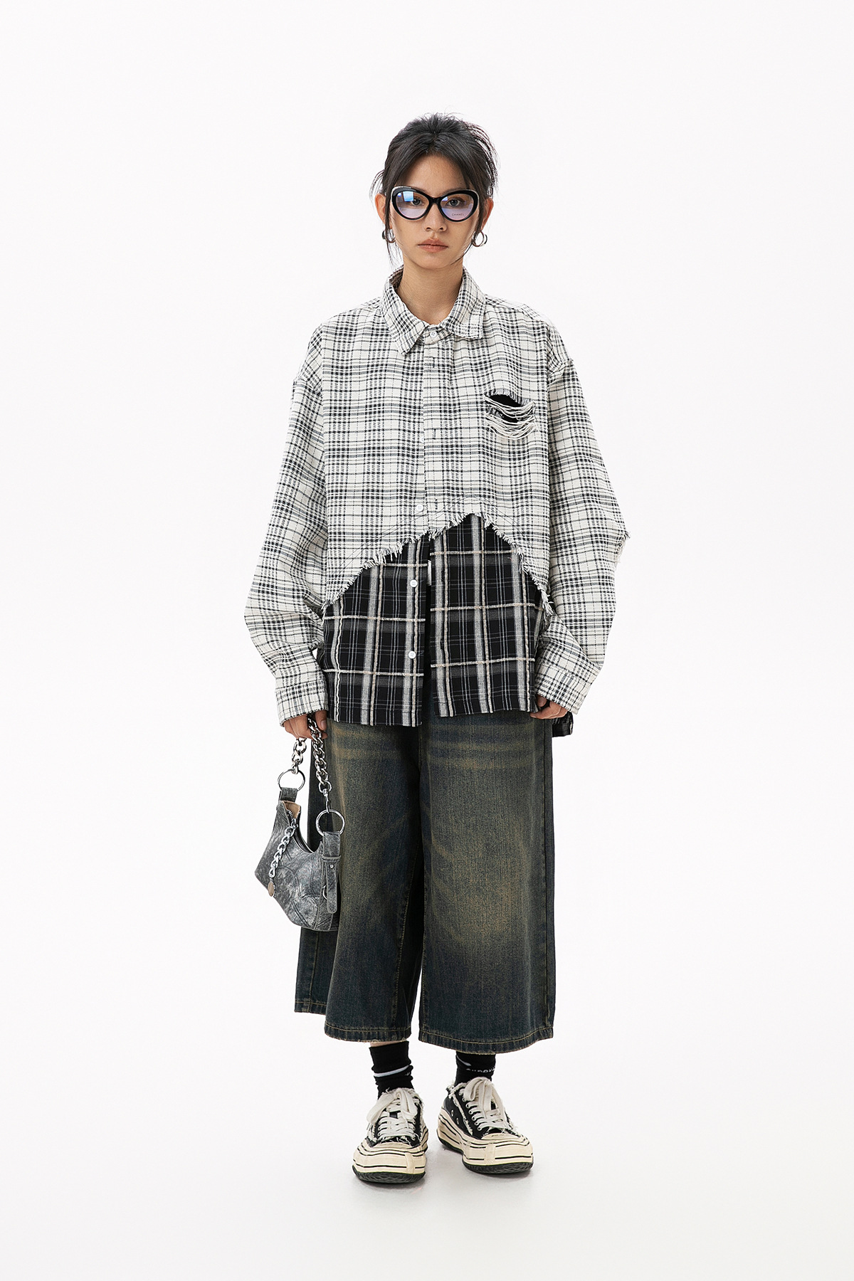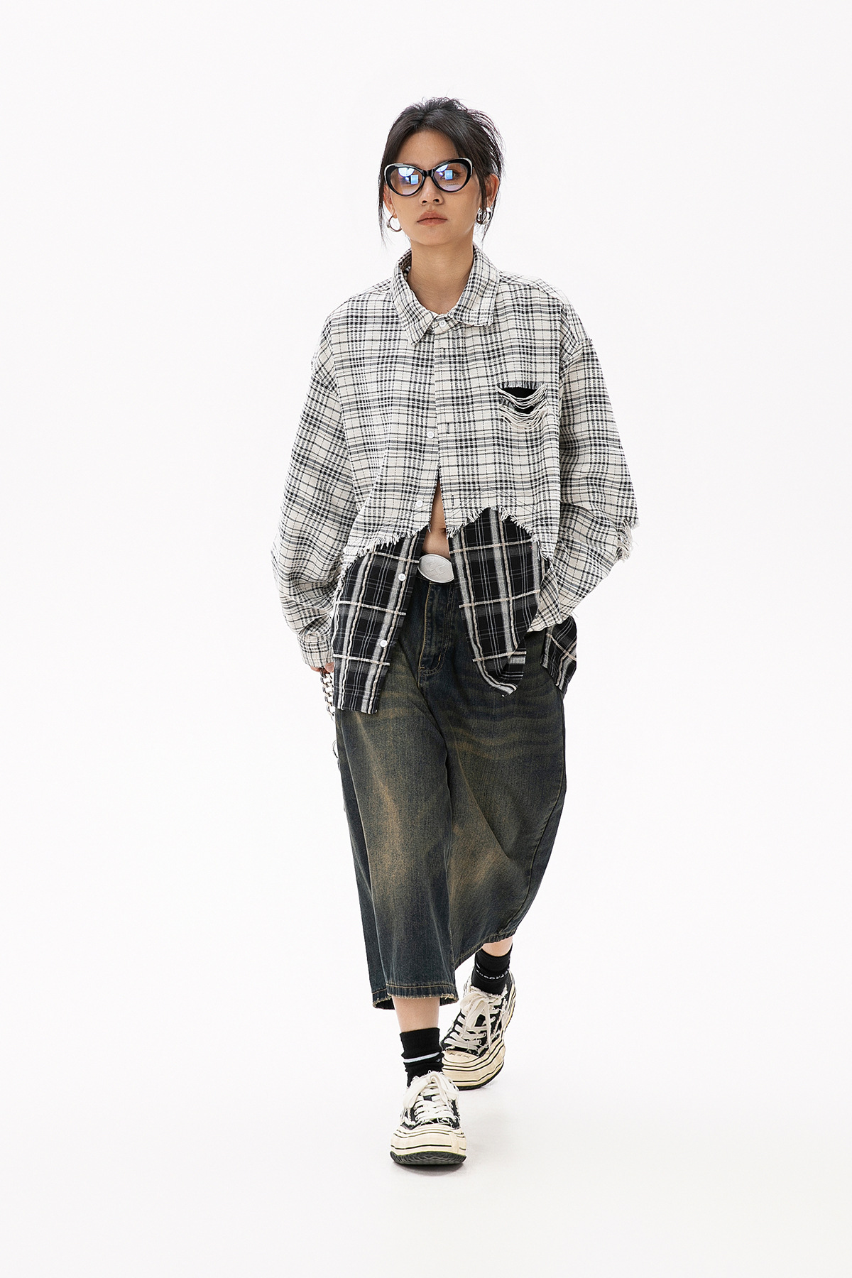 가이쿠 남성복 2026 신상 일본풍 빈티지 스타일 데미지 패치워크 셔닐 체크 셔츠 빈티지 느낌 셔츠