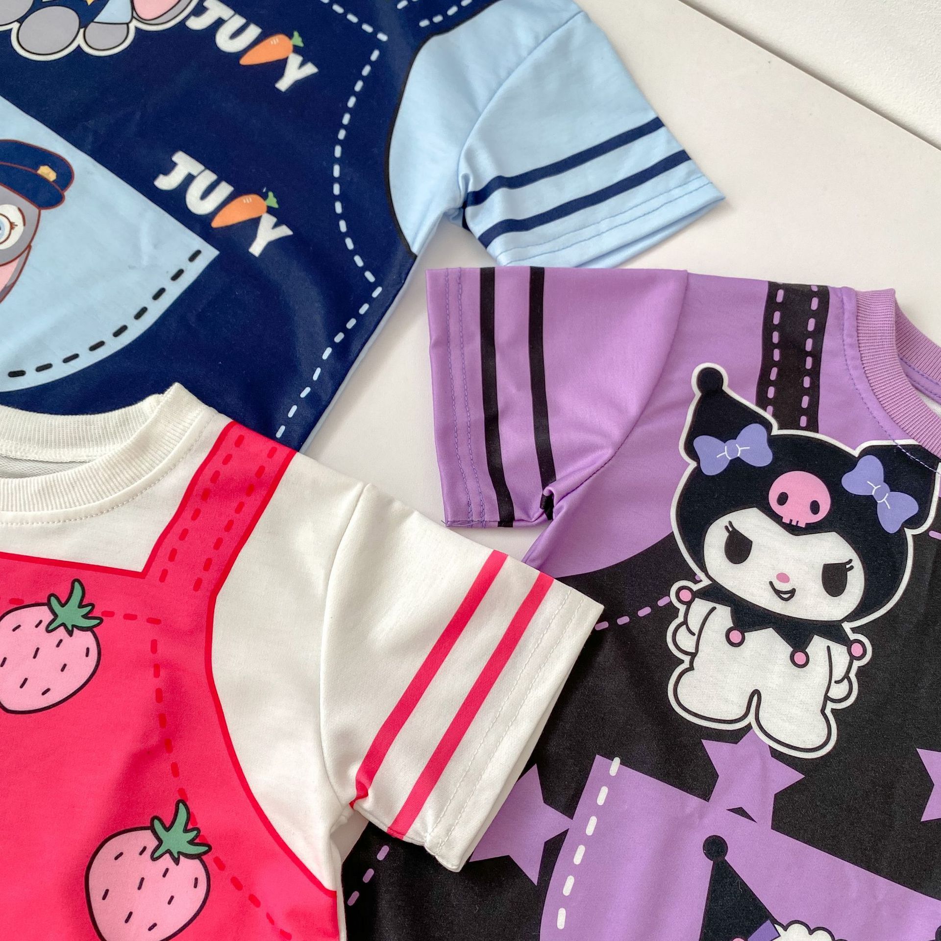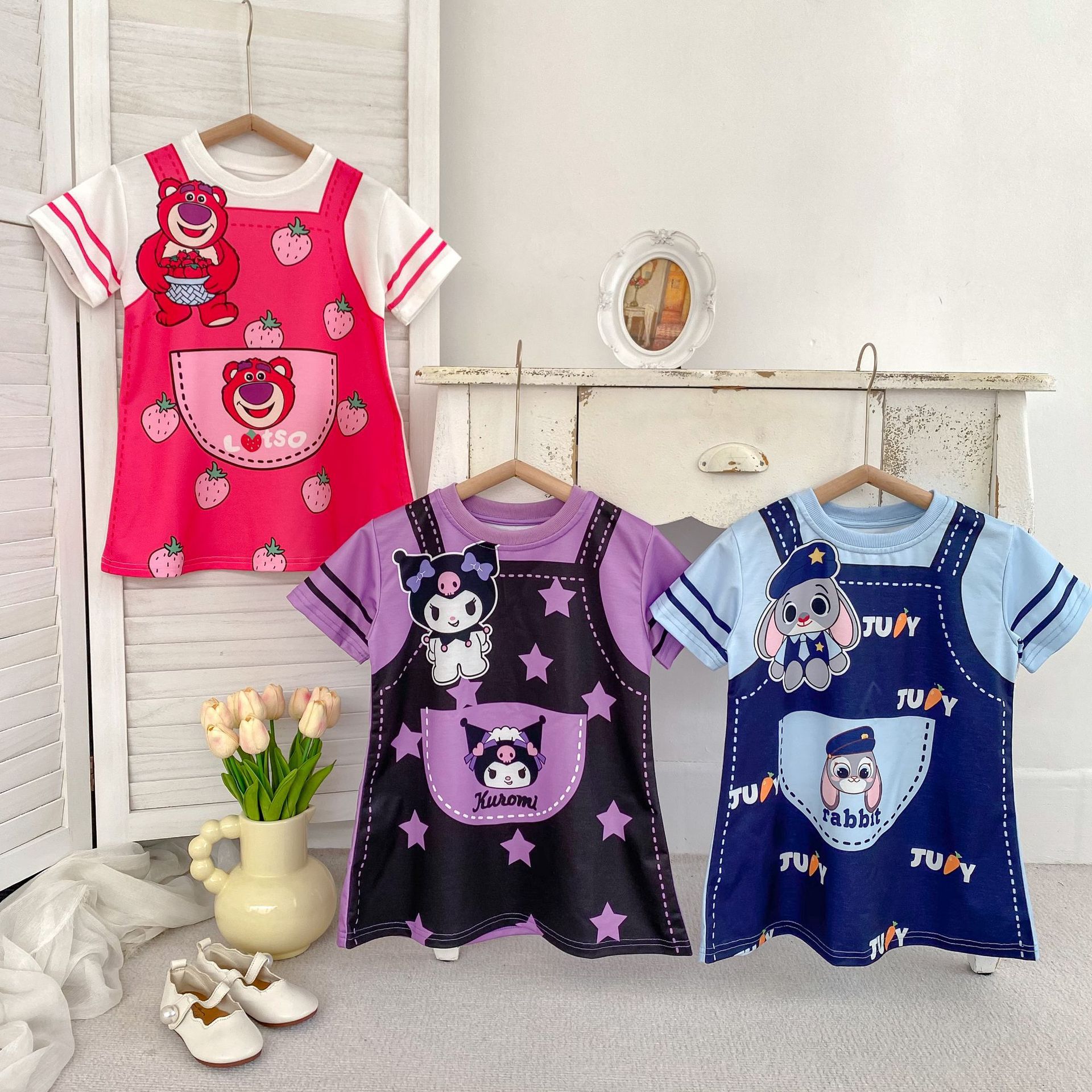 한국 스타일 여름 소녀의 아기 딸기 곰 콜로 미 주디 토끼 원피스 3 색 만화 가짜 투피스 티셔츠 원피스