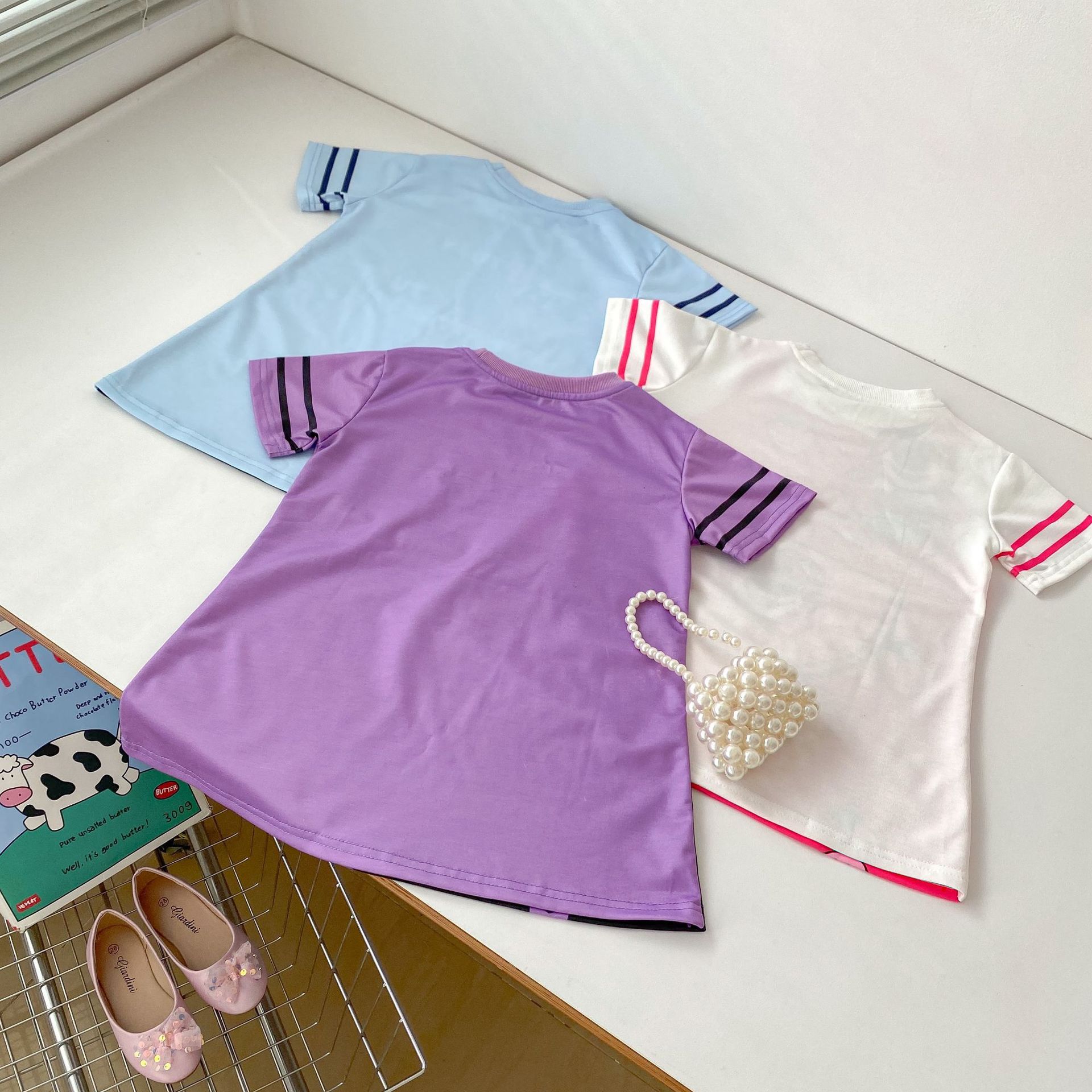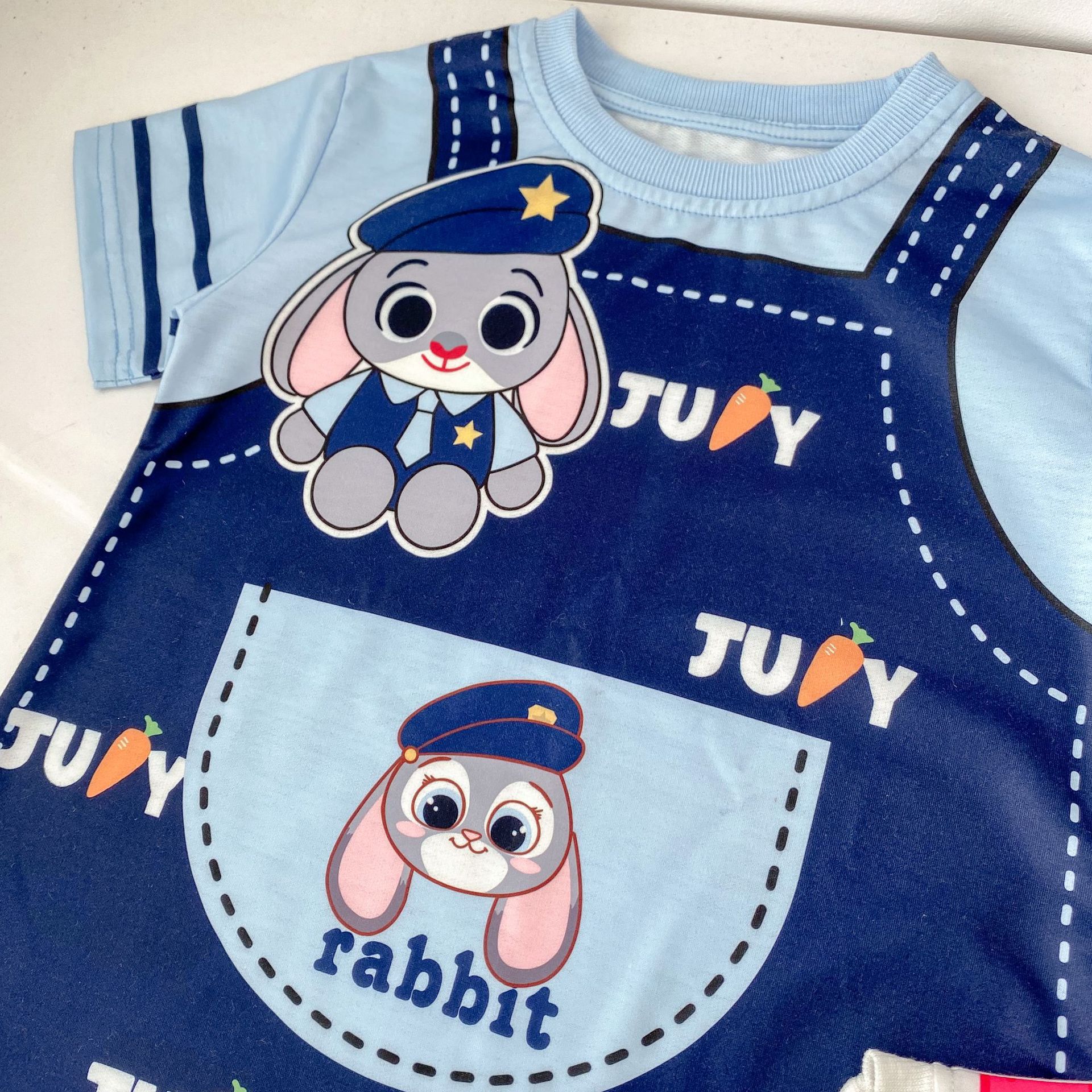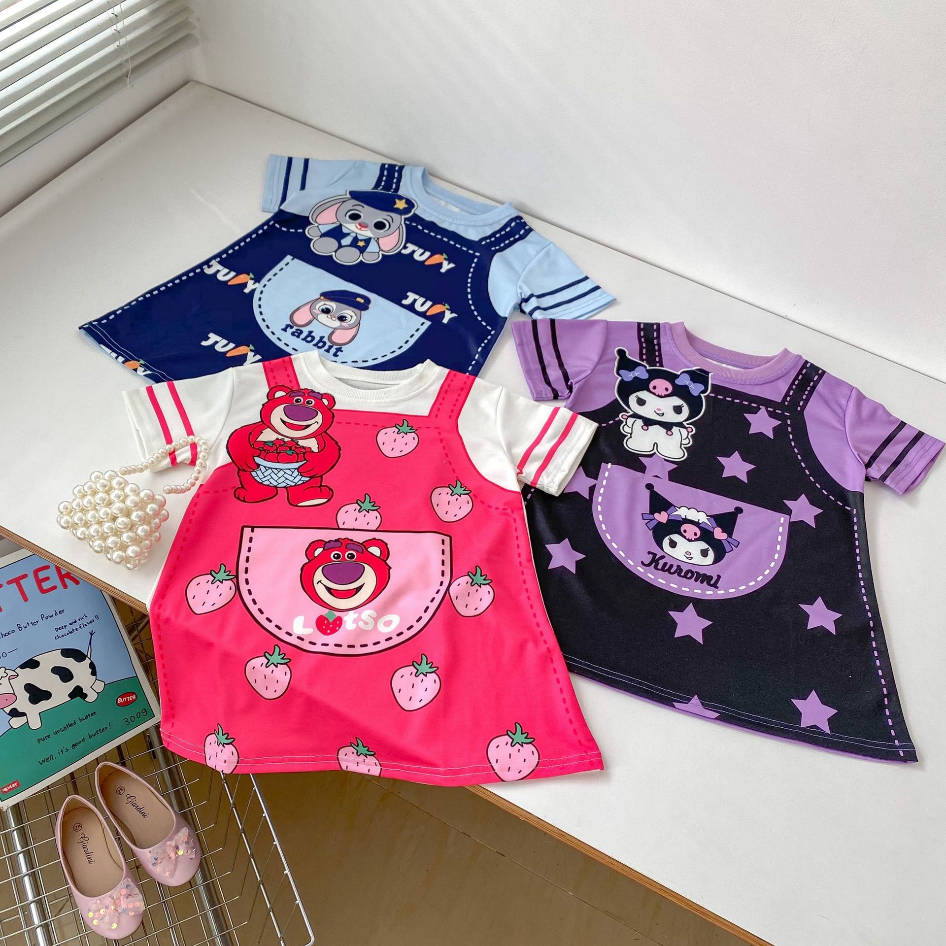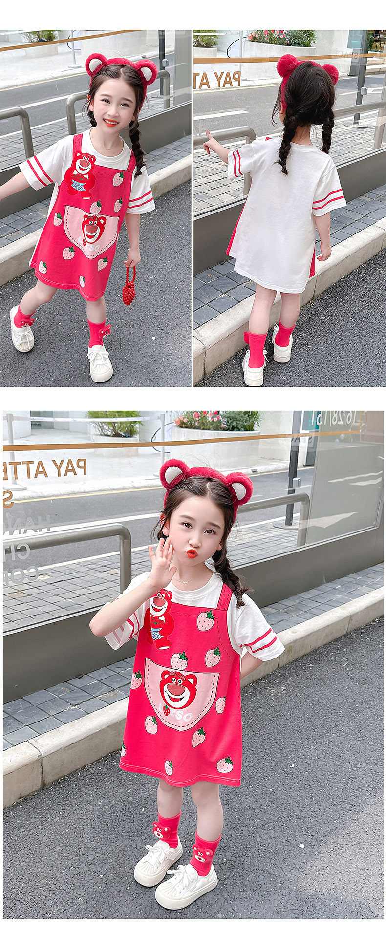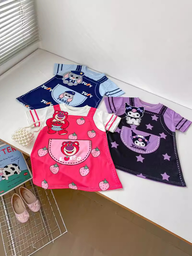 한국 스타일 여름 소녀의 아기 딸기 곰 콜로 미 주디 토끼 원피스 3 색 만화 가짜 투피스 티셔츠 원피스스토어 가기