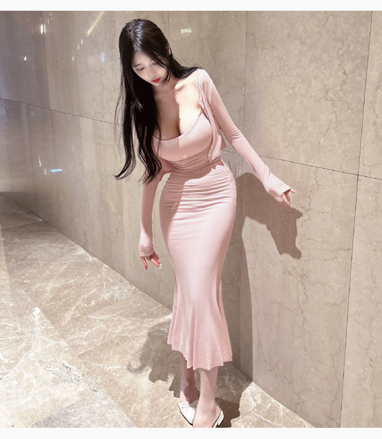 한국 동대문 패션 세트 섹시한 여성 슬링 원피스 긴 소매 작은 카디건 투피스 세트