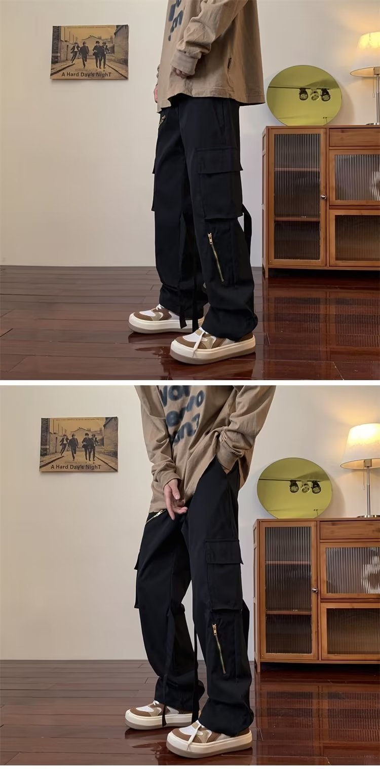 아메리칸 스타일 하이 스트리트 지퍼 디자인 센스 기능성 작업복 바지 남성 가을 패션 브랜드 소박한 바지 스트레이트 하이 스트리트 캐주얼 바지