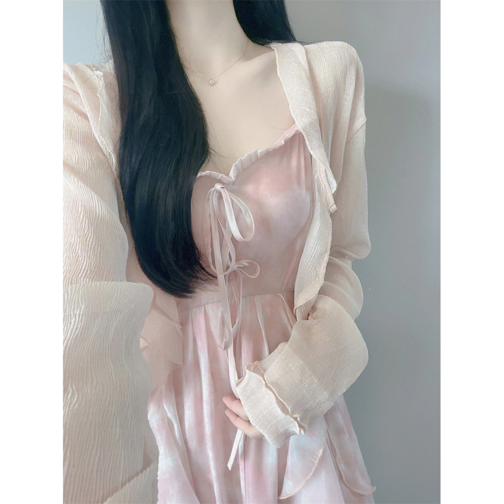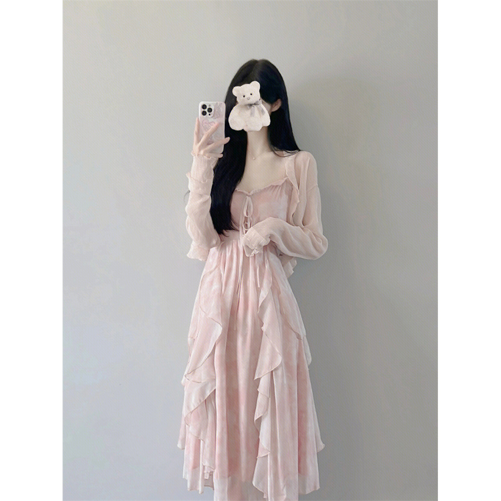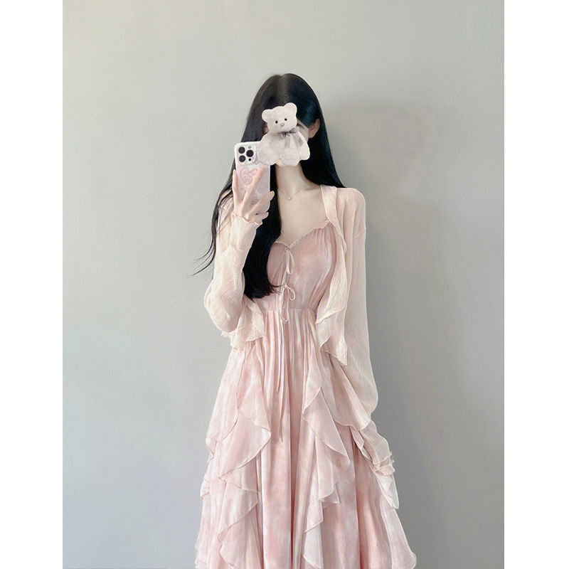 부드러운 스타일 원피스 봄 V 넥 슬링 요정 원피스 고급 달콤한 우아한 원피스 목도리 투피스 세트
