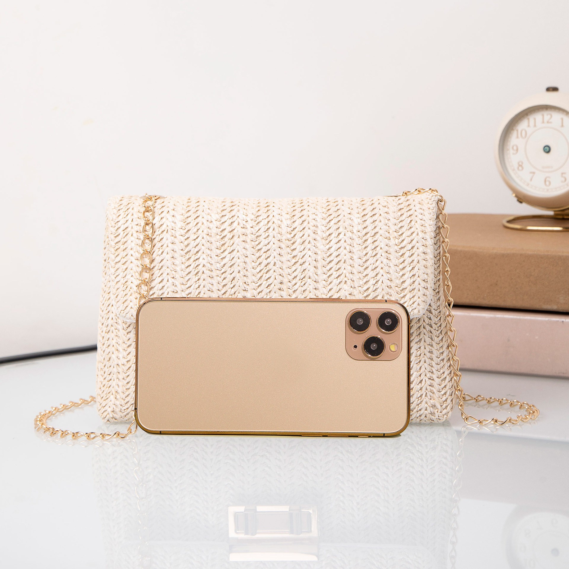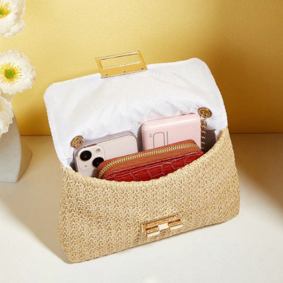 패션 밀짚 소재 더블 잠금 장치 숄더백 2025 신상 트렌디한 다용도 한국 스타일 심플 스몰 스퀘어백스토어 가기