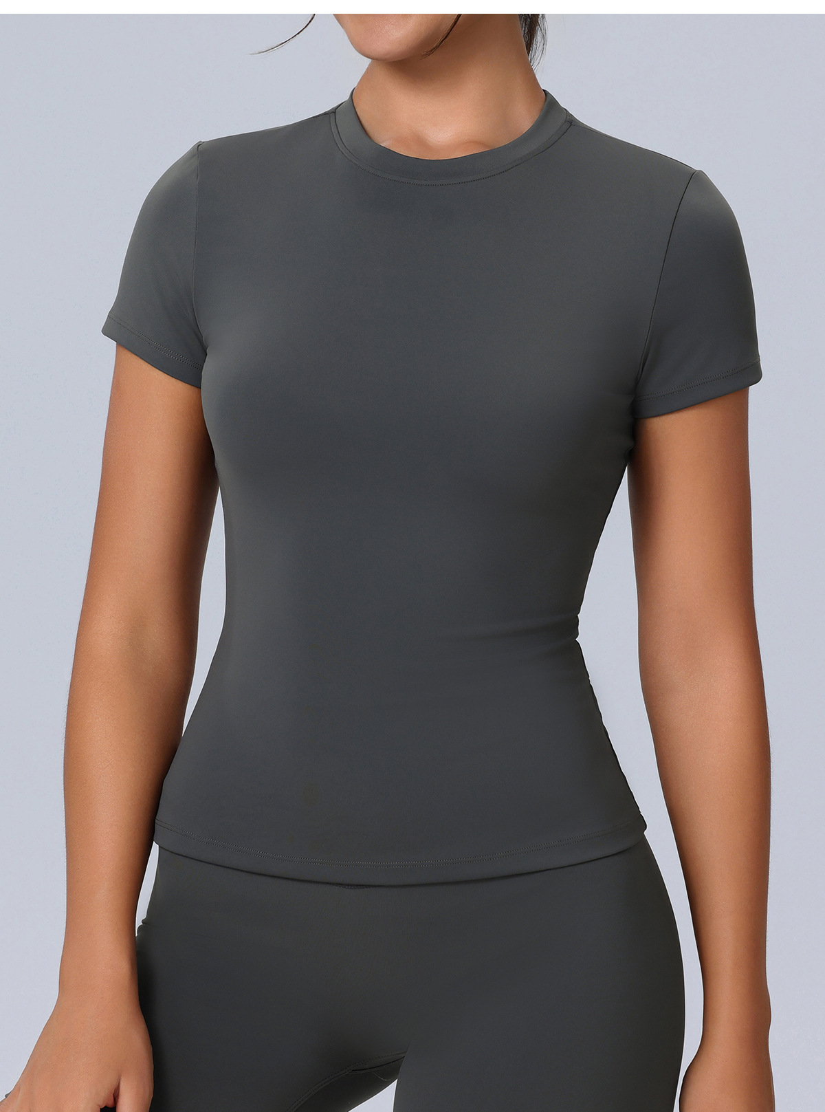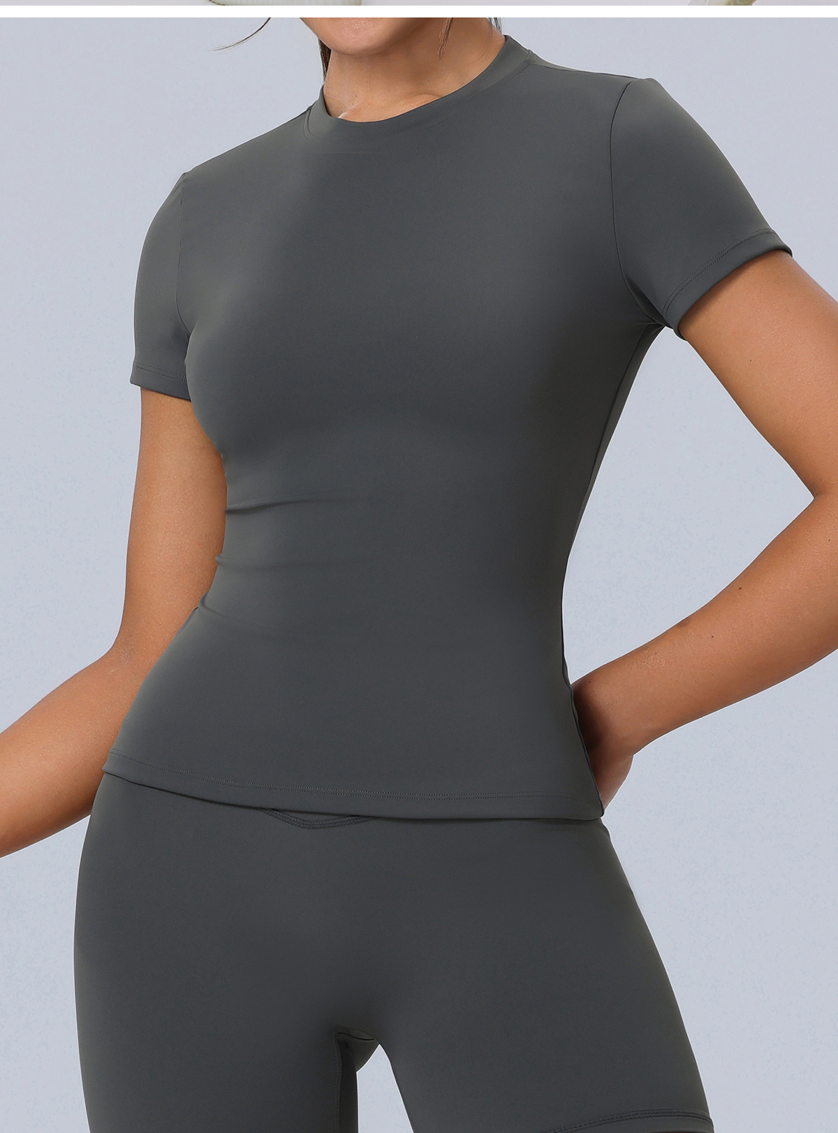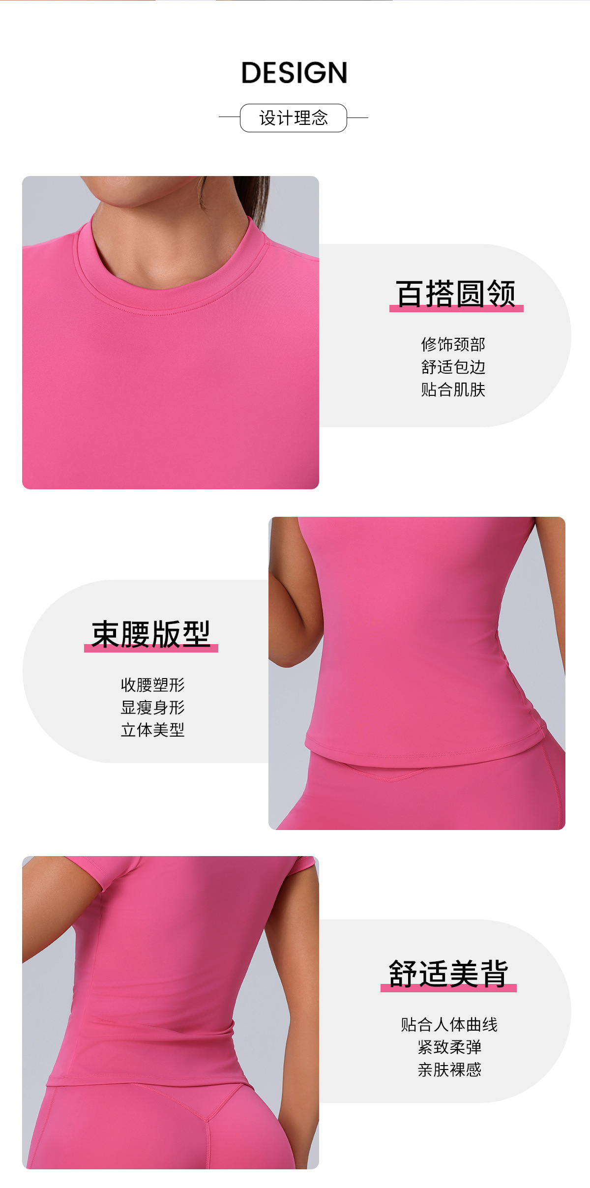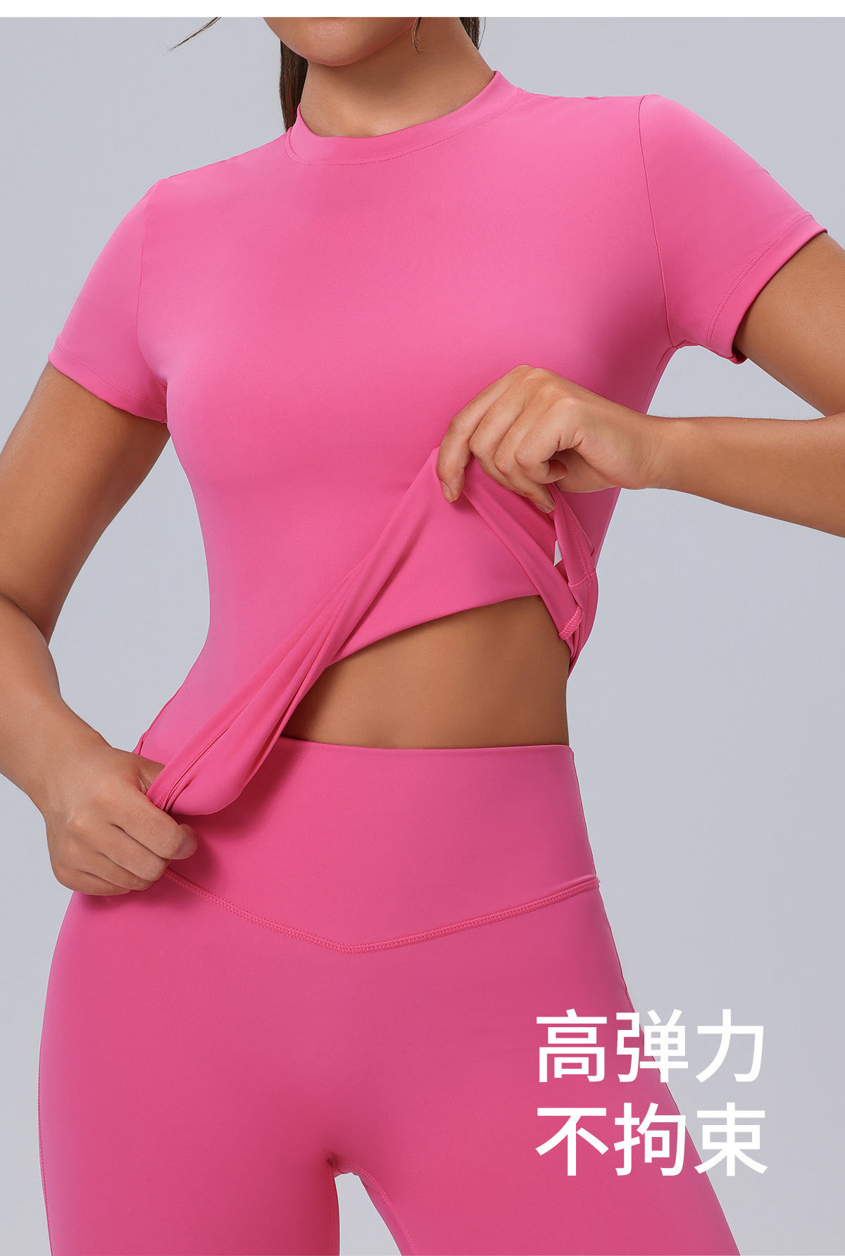 국경을 넘는 신상 라운드넥 피트니스웨어 반팔 여성용 속건 통기성 타이트 스포츠웨어 야외 러닝 요가웨어 상의