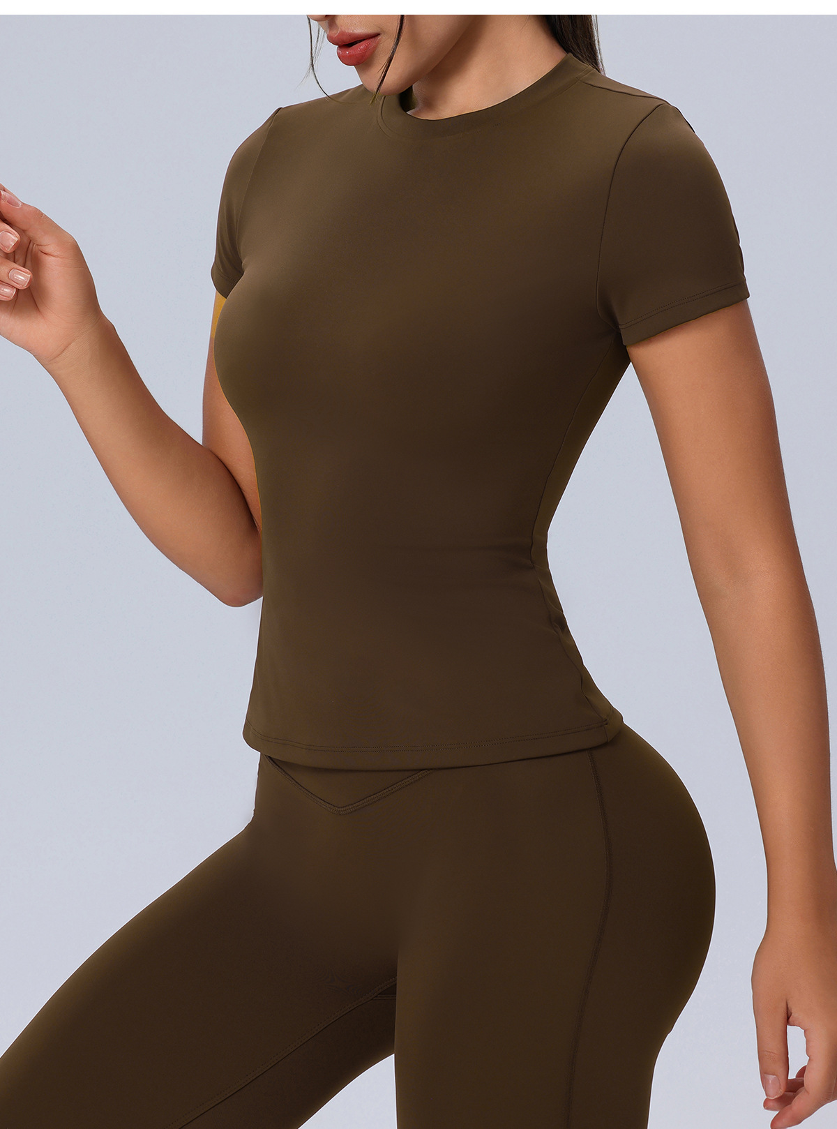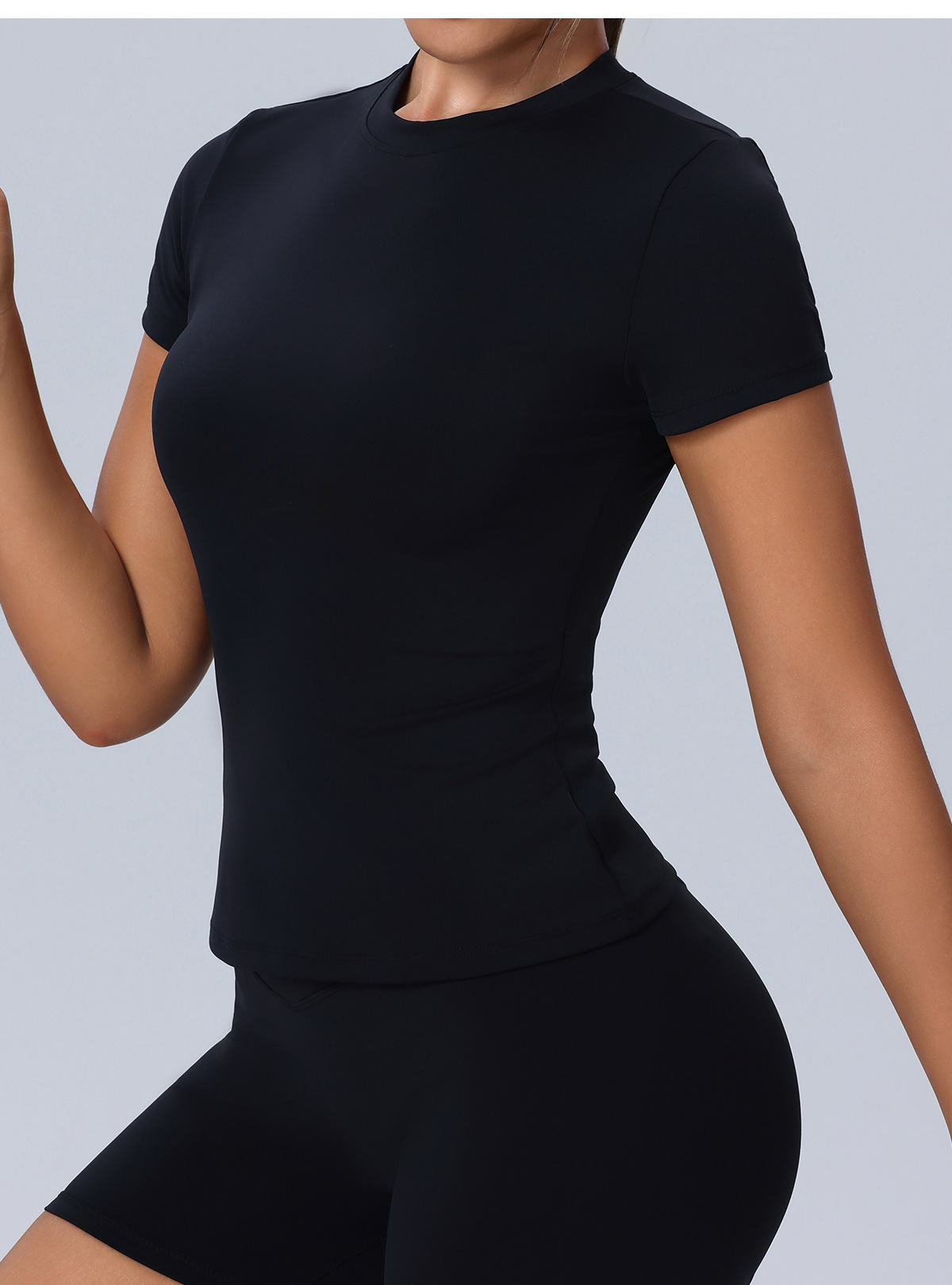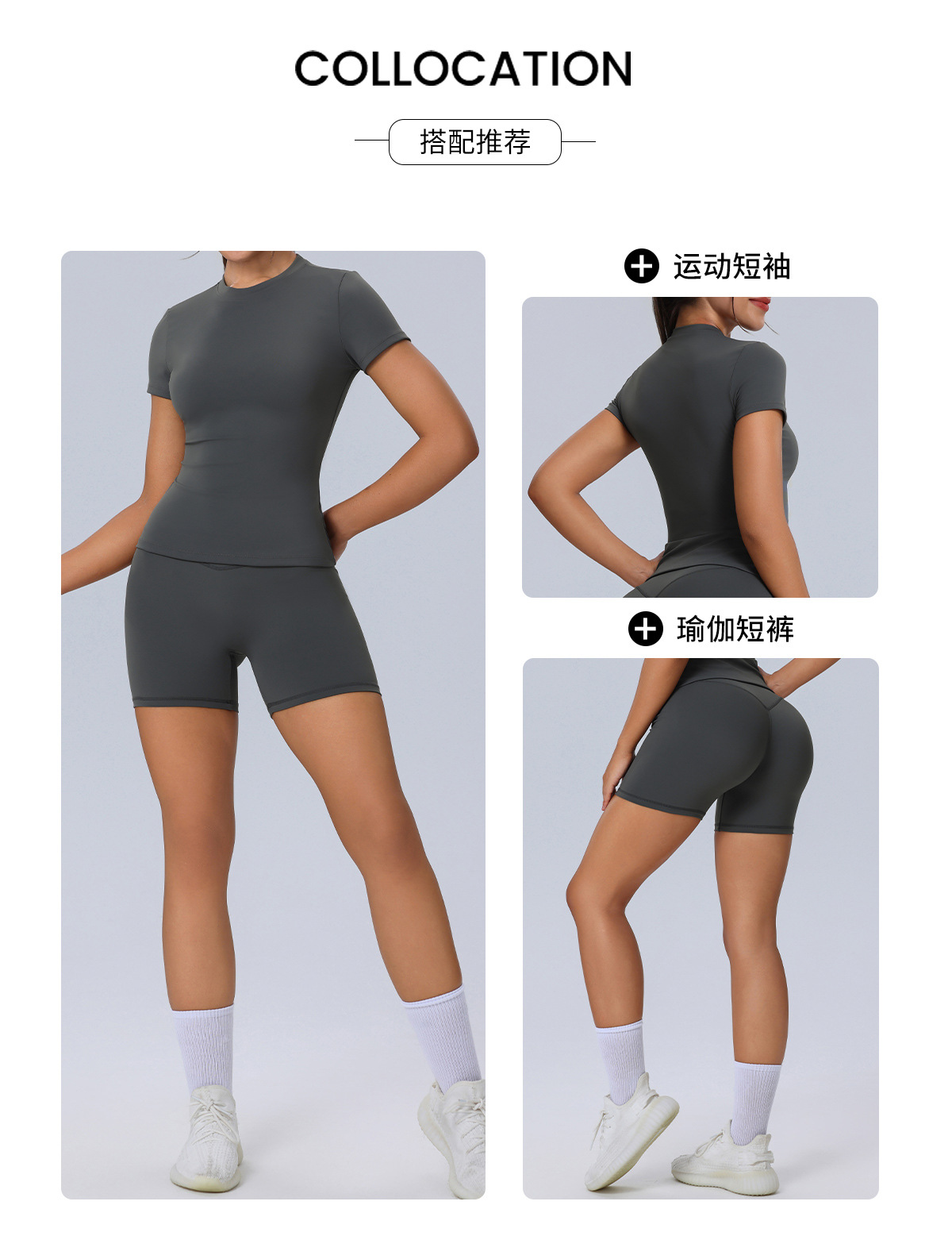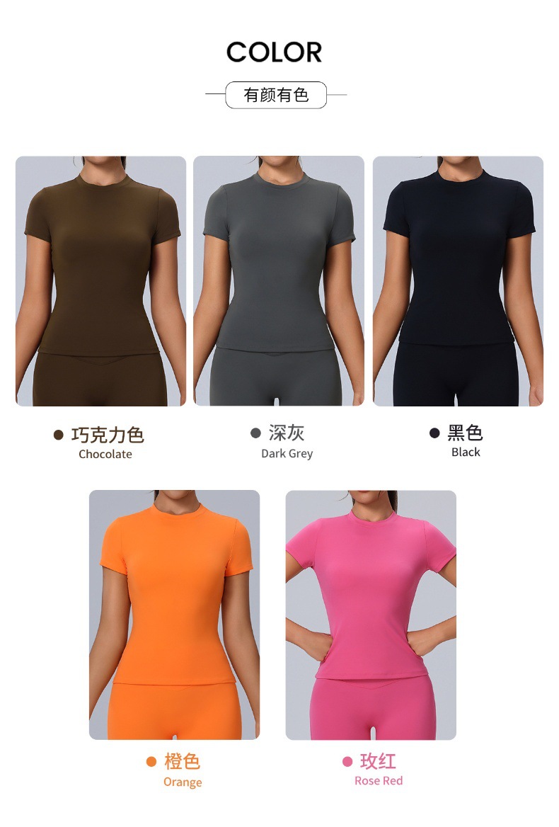 국경을 넘는 신상 라운드넥 피트니스웨어 반팔 여성용 속건 통기성 타이트 스포츠웨어 야외 러닝 요가웨어 상의