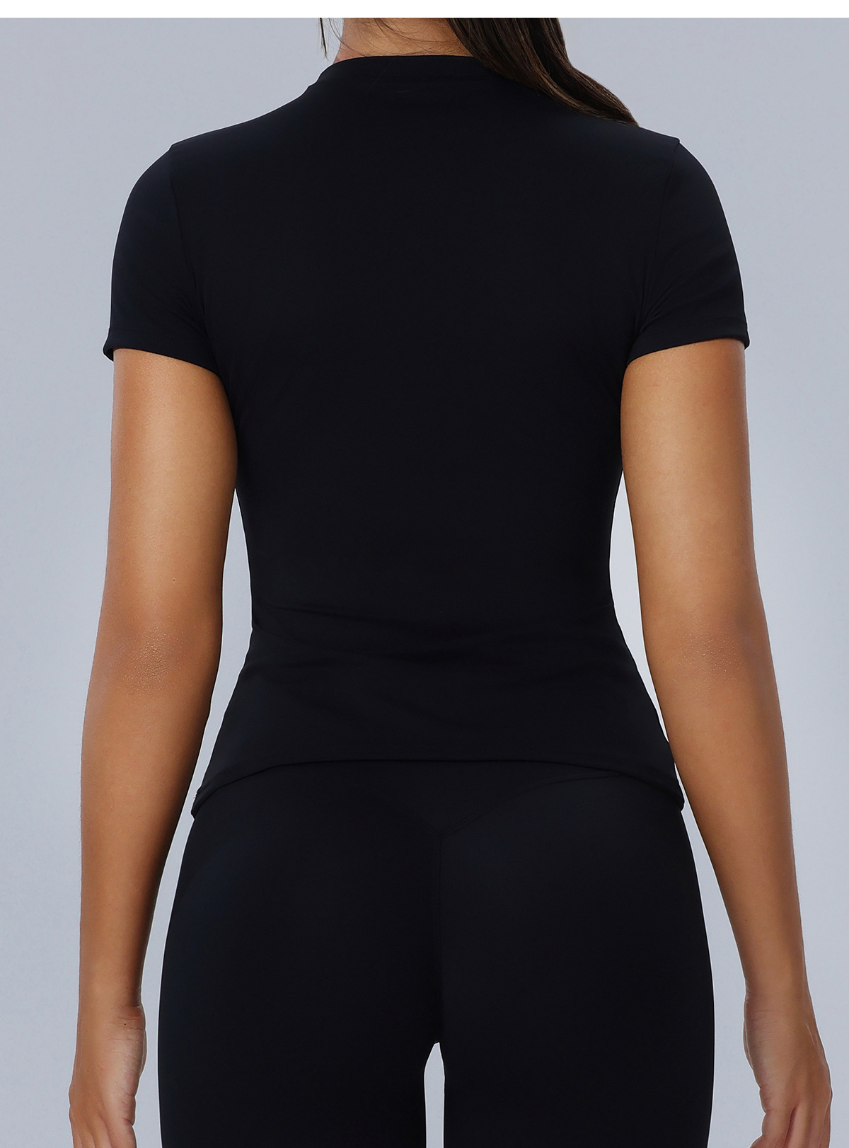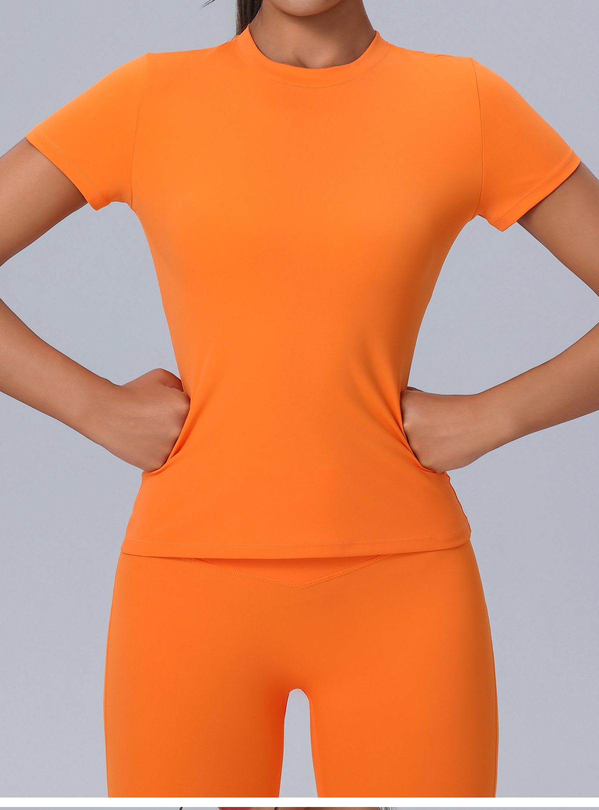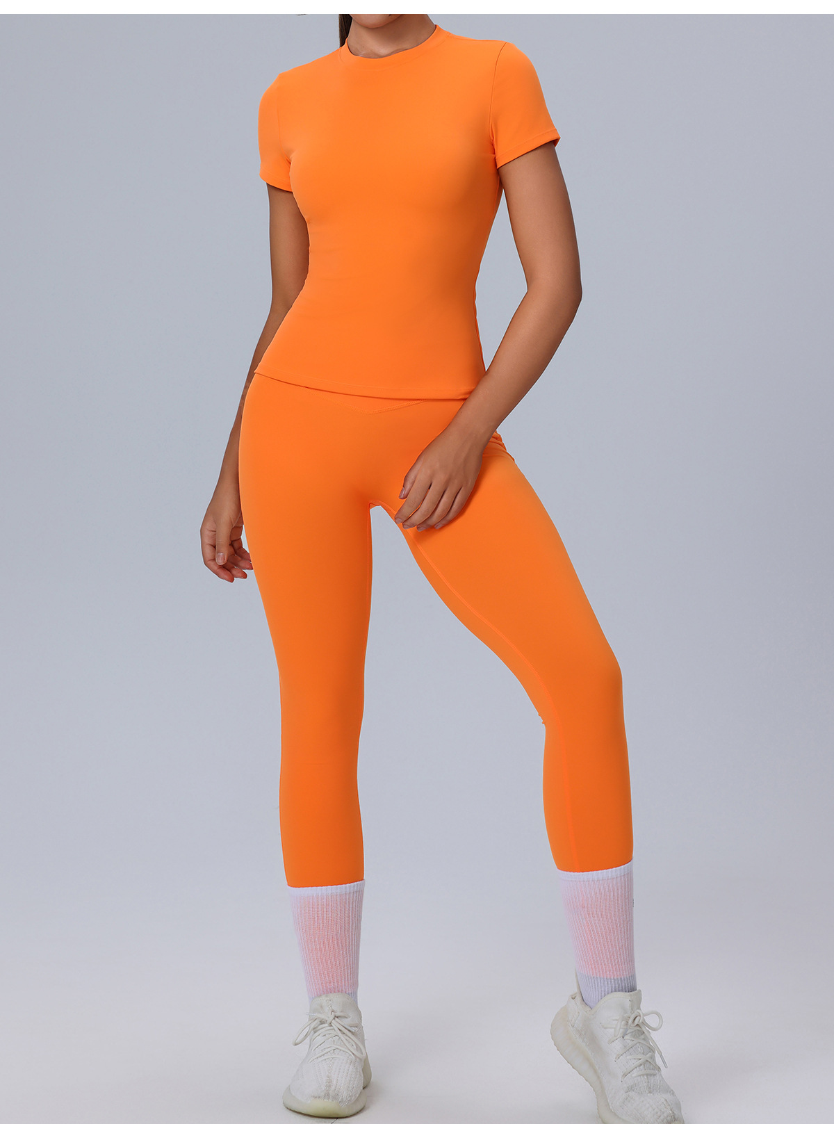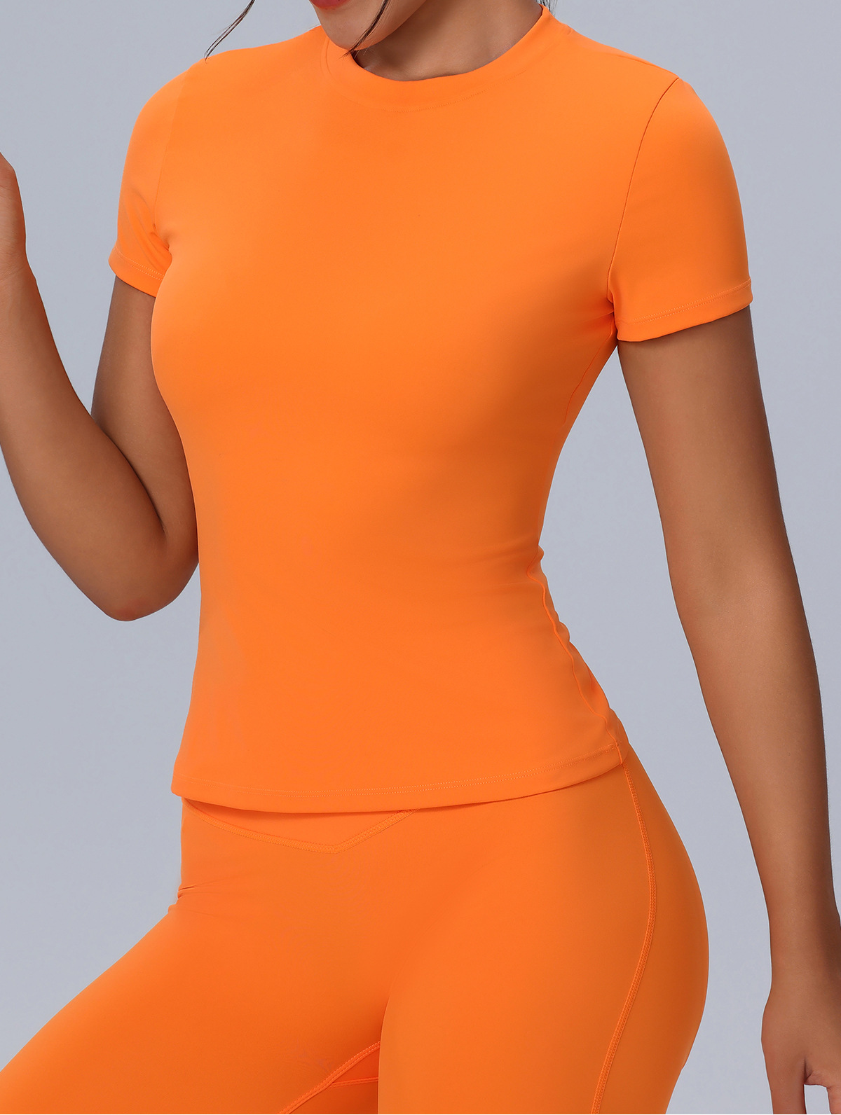 국경을 넘는 신상 라운드넥 피트니스웨어 반팔 여성용 속건 통기성 타이트 스포츠웨어 야외 러닝 요가웨어 상의