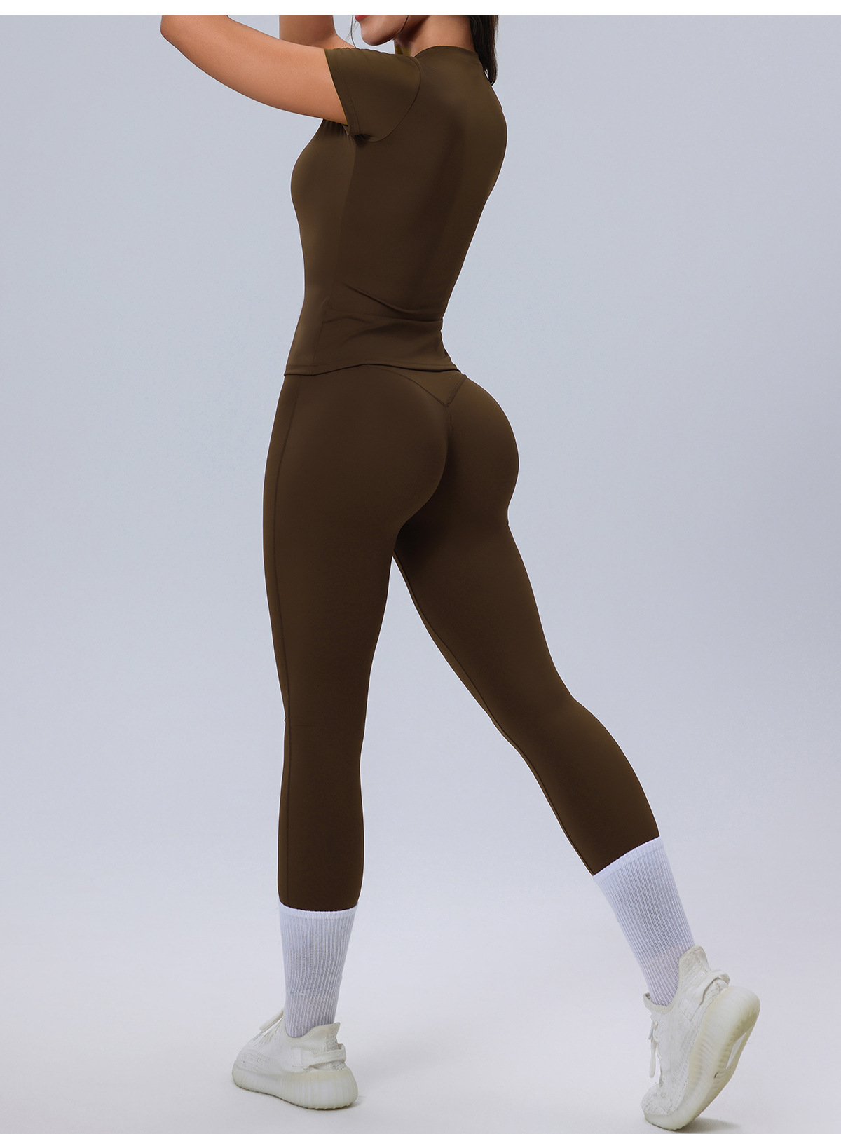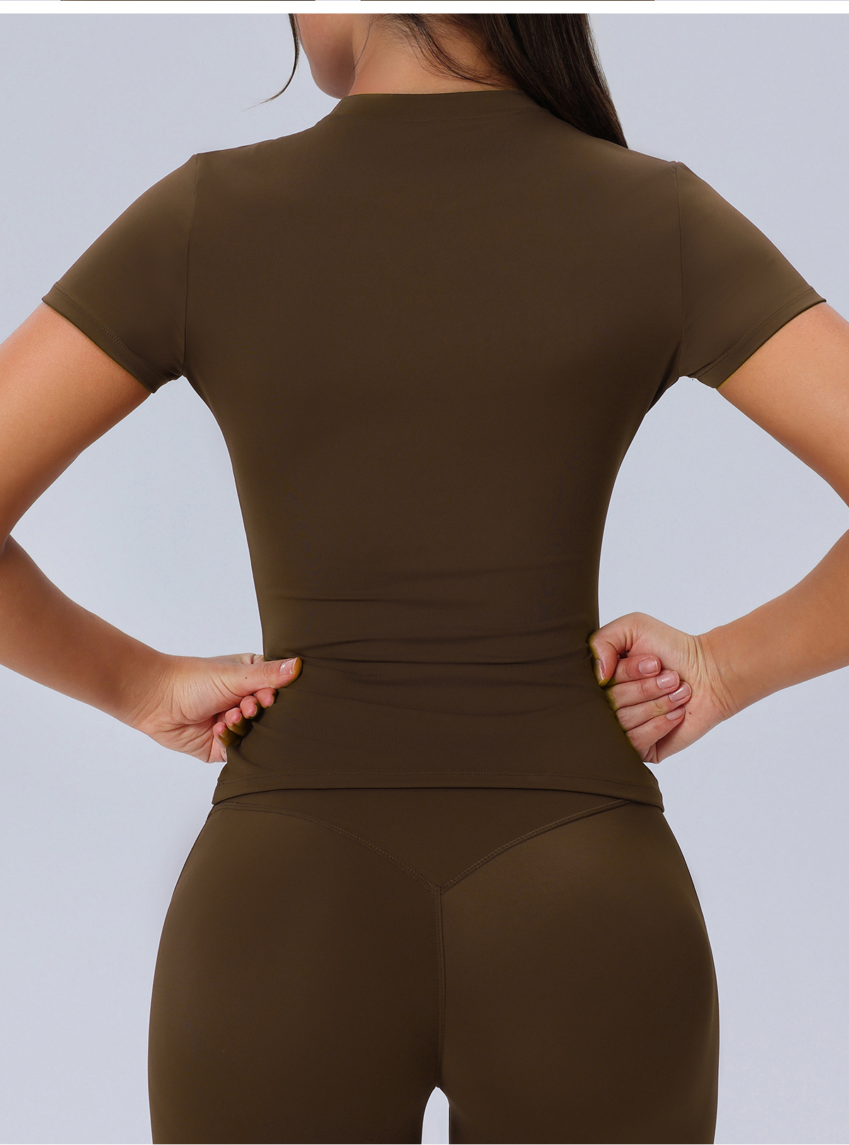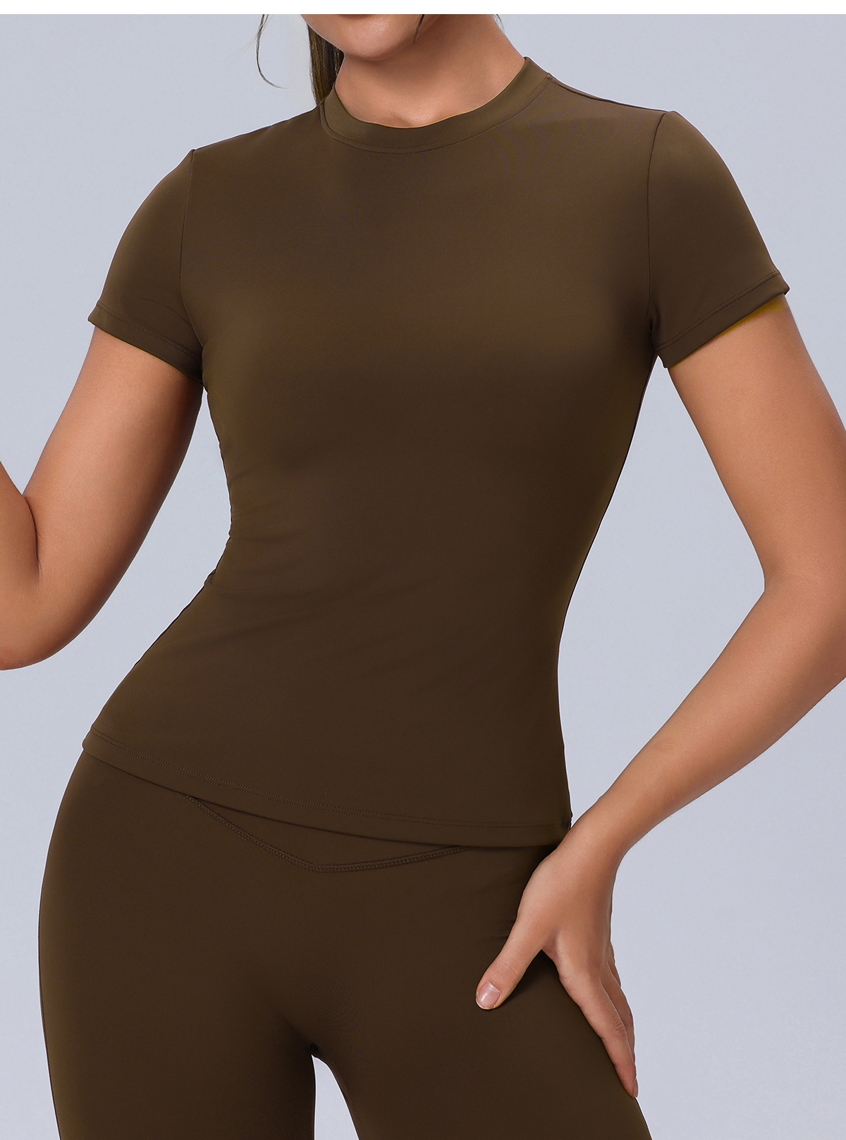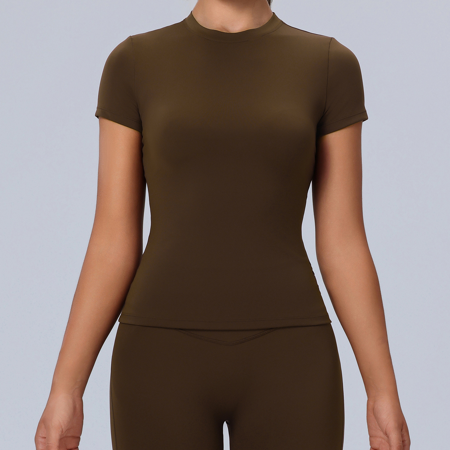 국경을 넘는 신상 라운드넥 피트니스웨어 반팔 여성용 속건 통기성 타이트 스포츠웨어 야외 러닝 요가웨어 상의