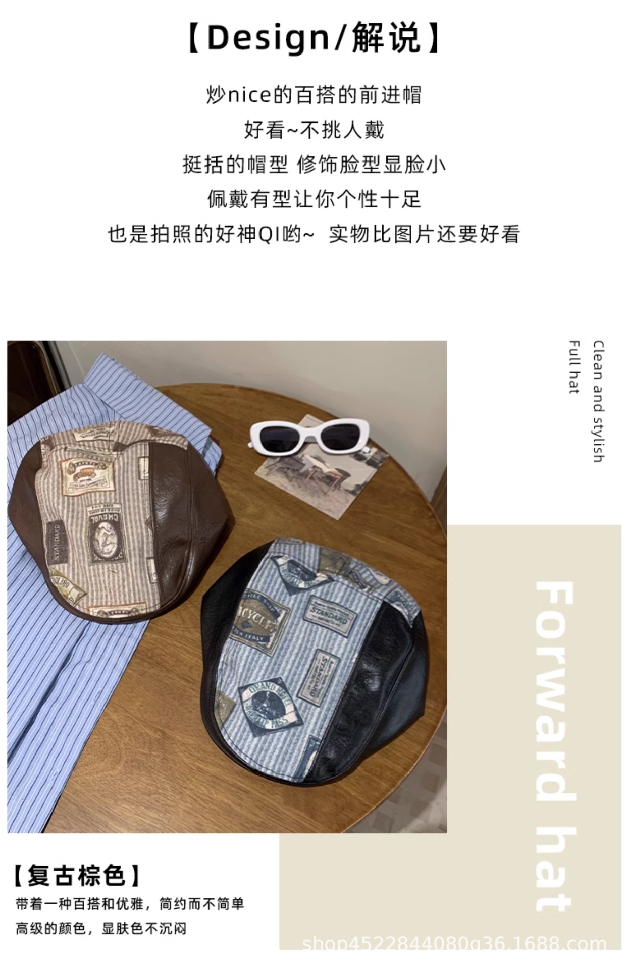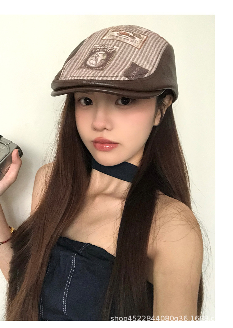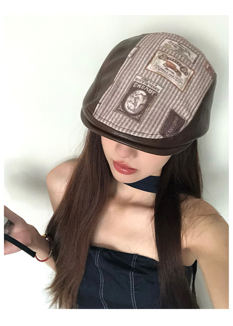 미국 스타일 레트로 핫 걸 인쇄 PU 가죽 앞으로 모자 여성 올매치 틈새 예술적 영국 안티 웨어 베일리 모자 트렌디스토어 가기