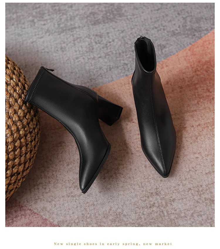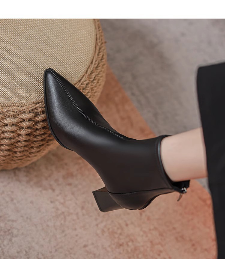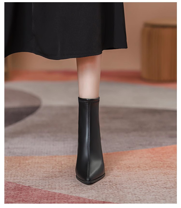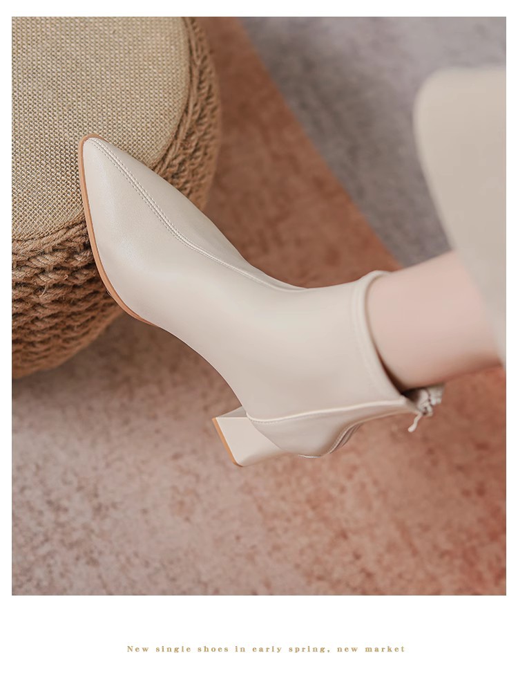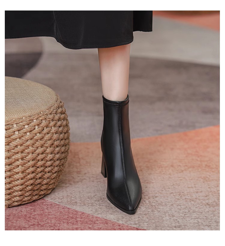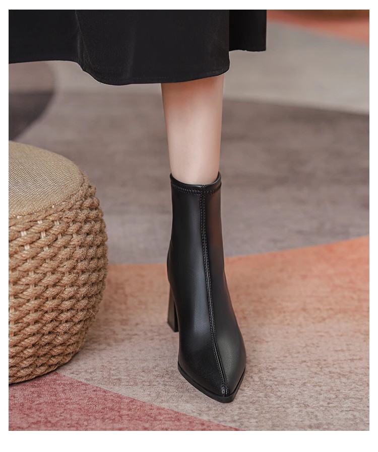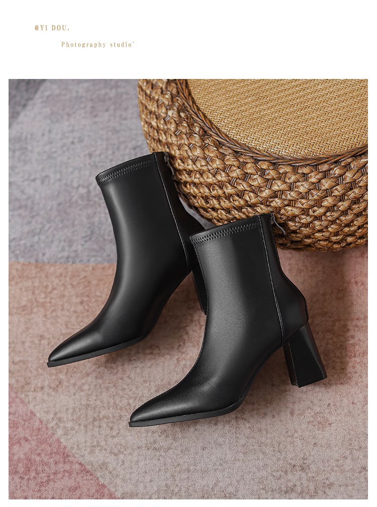 프랑스 뾰족한 하이힐 발목 부츠 여자 두꺼운 힐 미드 힐 2024 새로운 가을 및 겨울 여성 신발 올매치 얇은 알몸 부츠 마틴 부츠스토어 가기