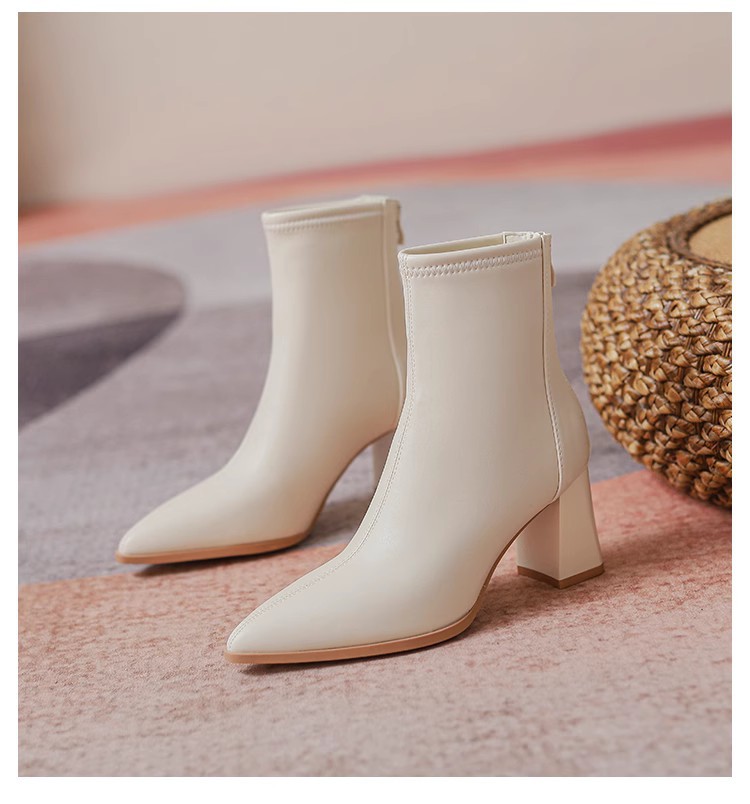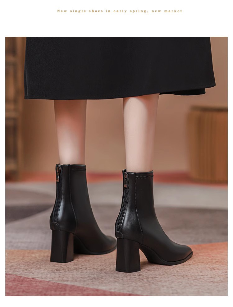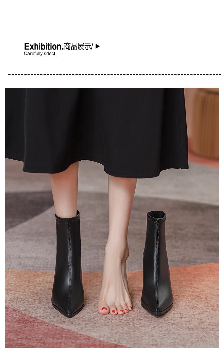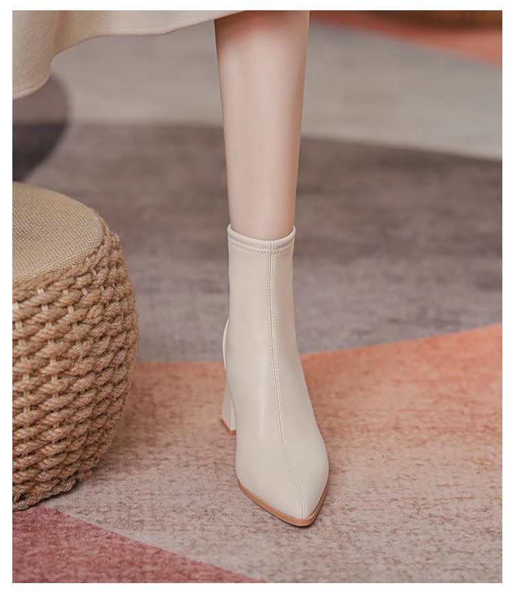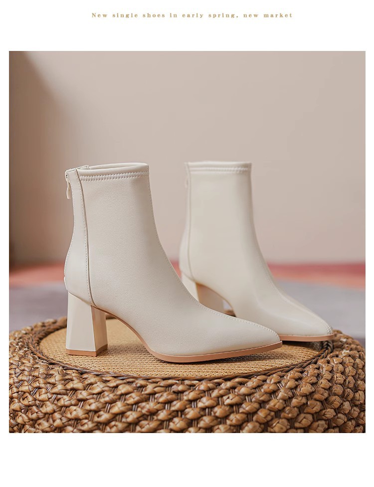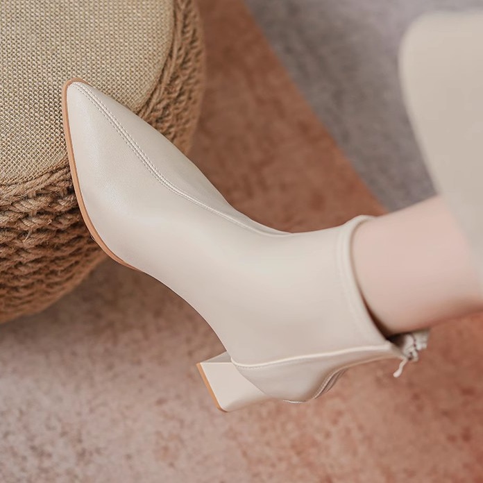 프랑스 뾰족한 하이힐 발목 부츠 여자 두꺼운 힐 미드 힐 2024 새로운 가을 및 겨울 여성 신발 올매치 얇은 알몸 부츠 마틴 부츠스토어 가기